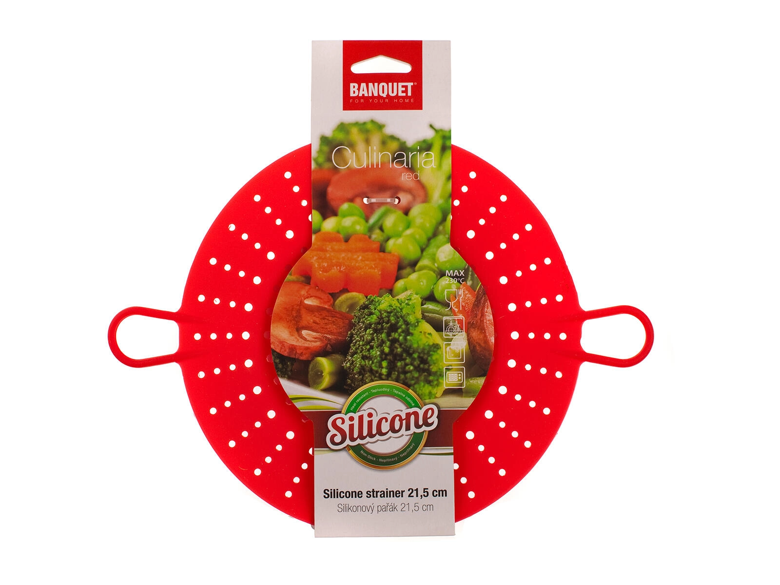 Con questa vaporiera in silicone CULINARIA preparerete facilmente piatti leggeri e sani. Il silicone flessibile si adatta alla vostra pentola, non graffia le superfici e, grazie alle proprietà antiscivolo, è comodo da maneggiare. Il design rosso dona un aspetto moderno alla vostra cucina.