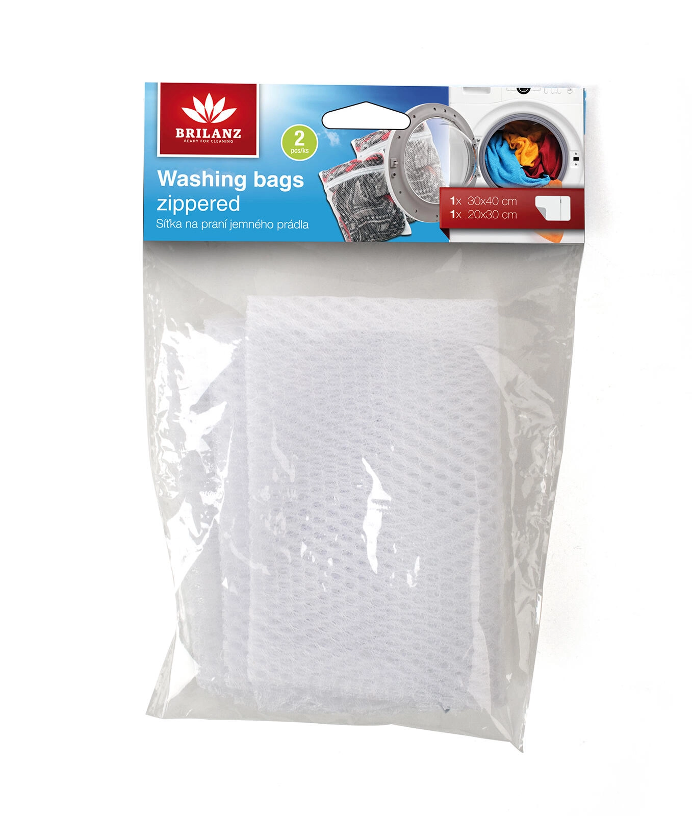 Pratico set di due sacchetti a rete per il lavaggio BRILANZ che protegge i capi delicati dai danni. Grazie alla rete robusta e alla zip affidabile, i tuoi capi non si annoderanno né si impiglieranno durante il lavaggio e la centrifuga. Rete fine, chiusura con zip e due dimensioni universali per proteggere facilmente tende, biancheria intima e tessuti delicati.