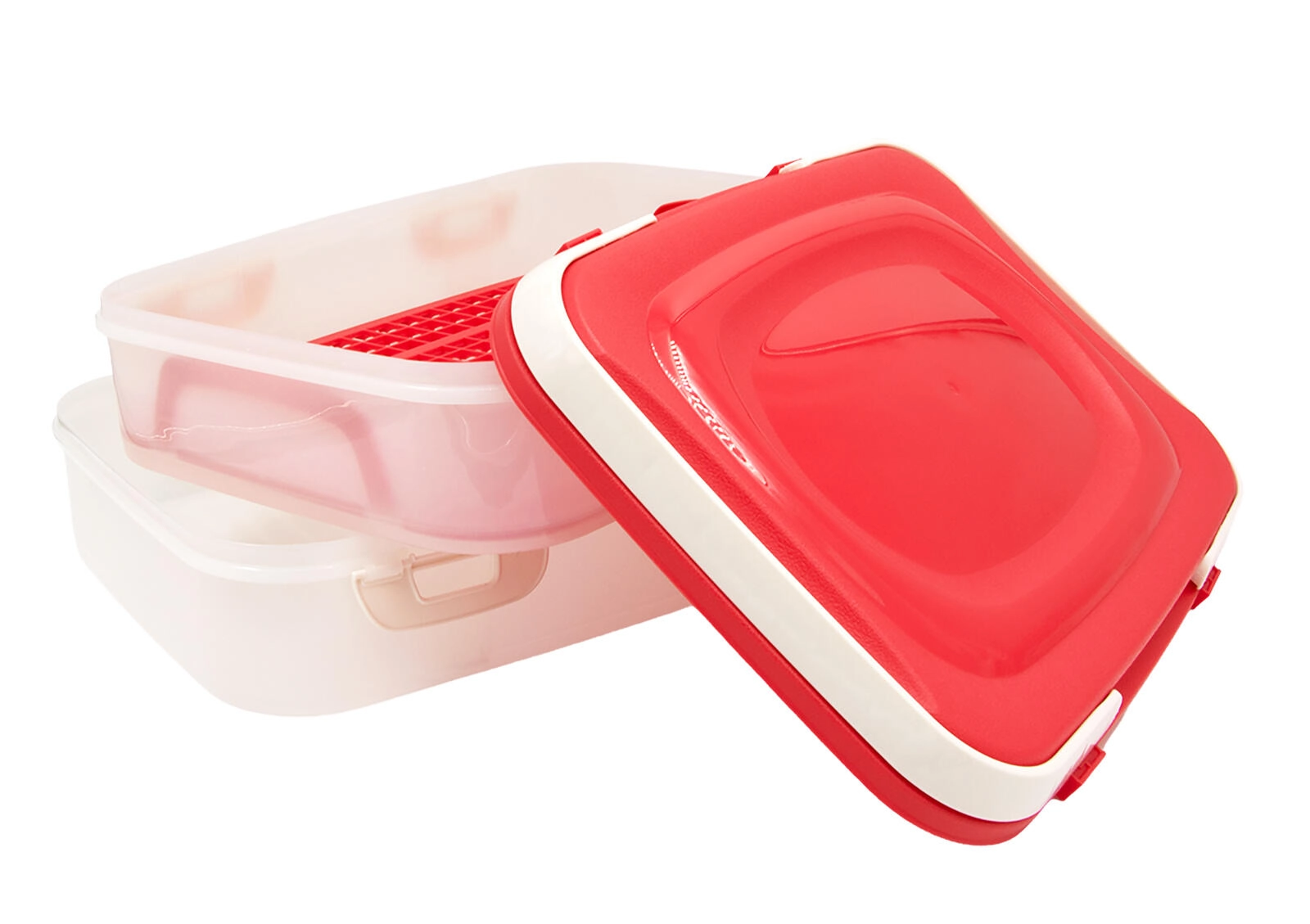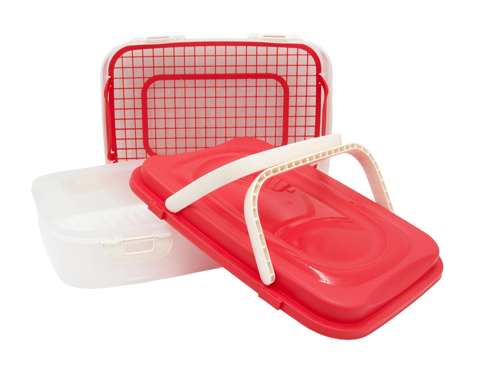 Pratico contenitore per alimenti a due livelli con clip robuste e maniglie pieghevoli, ideale per trasportare in sicurezza i cibi per picnic, feste e gite. Offre una capacità di circa 2 × 7 l, pareti trasparenti per un rapido controllo del contenuto e una chiusura affidabile contro le fuoriuscite. Include una griglia interna per estrarre facilmente gli alimenti. Plastica resistente, sistema impilabile a 2 livelli e trasporto confortevole grazie alle maniglie integrate.