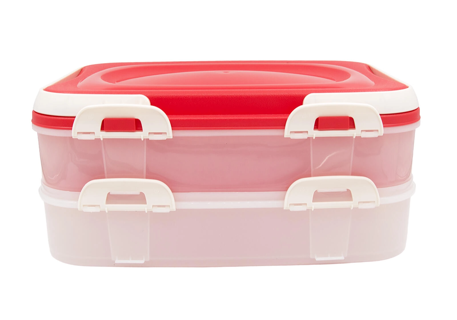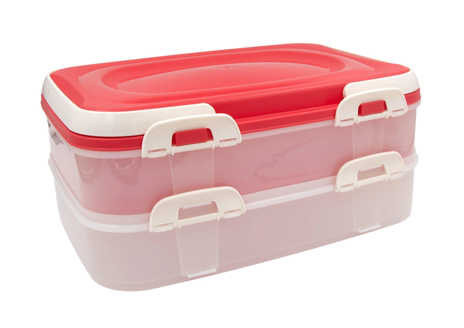 Cercate una scatola pratica per tramezzini, dolci, frutta o prodotti da forno? Questo contenitore portatile a 2 livelli con clip robuste e maniglie assicura che i vostri alimenti arrivino a destinazione freschi e ben sigillati. Le pareti trasparenti consentono un rapido controllo del contenuto e il coperchio rosa aggiunge un tocco elegante a ogni tavola.