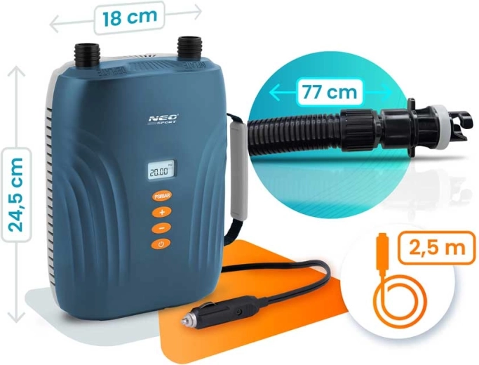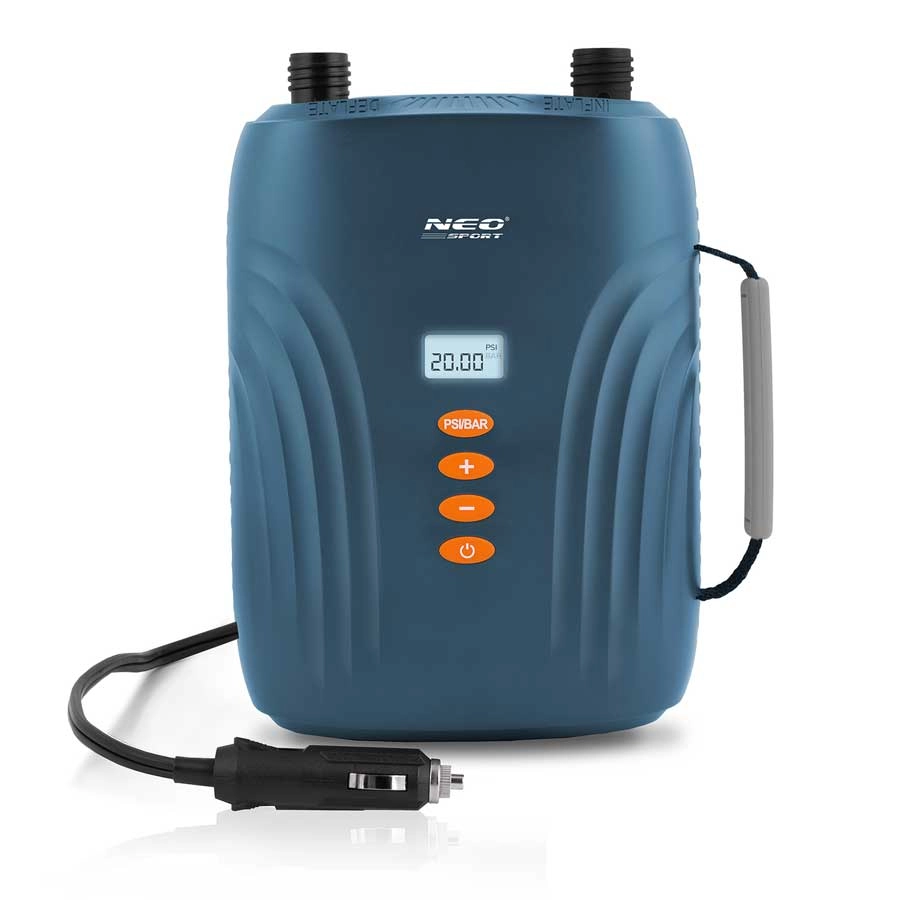 La pompa elettrica NEO-SPORT è un assistente affidabile per sport acquatici e campeggio. Si collega facilmente alla presa auto 12 V, imposti i valori di pressione desiderati sul display LED e premi start. I due motori con sistema Double Motor™ riempiono prima rapidamente il volume e poi regolano con precisione fino a 20 PSI – veloce, comodo e senza sforzo.