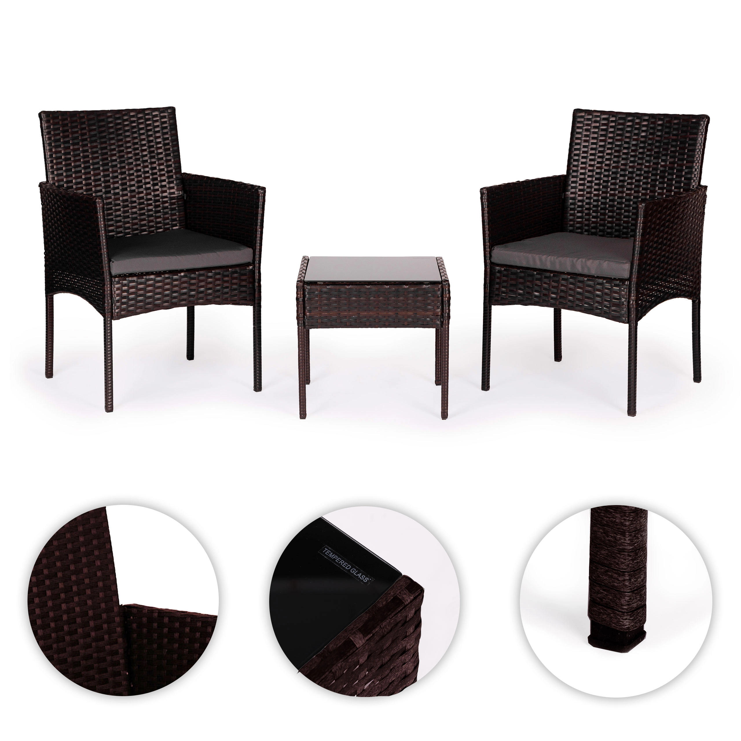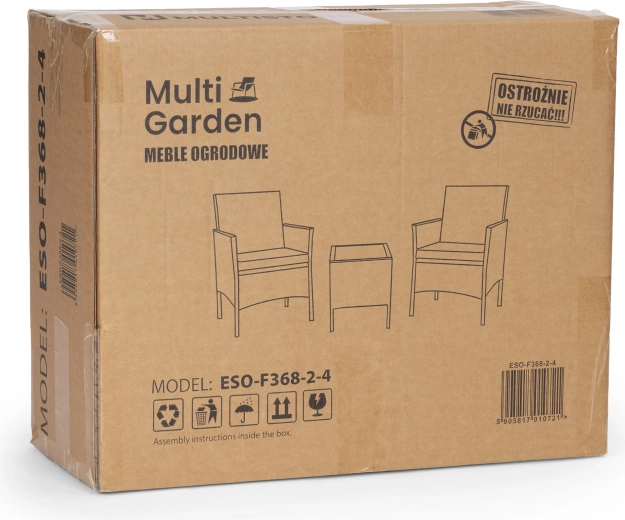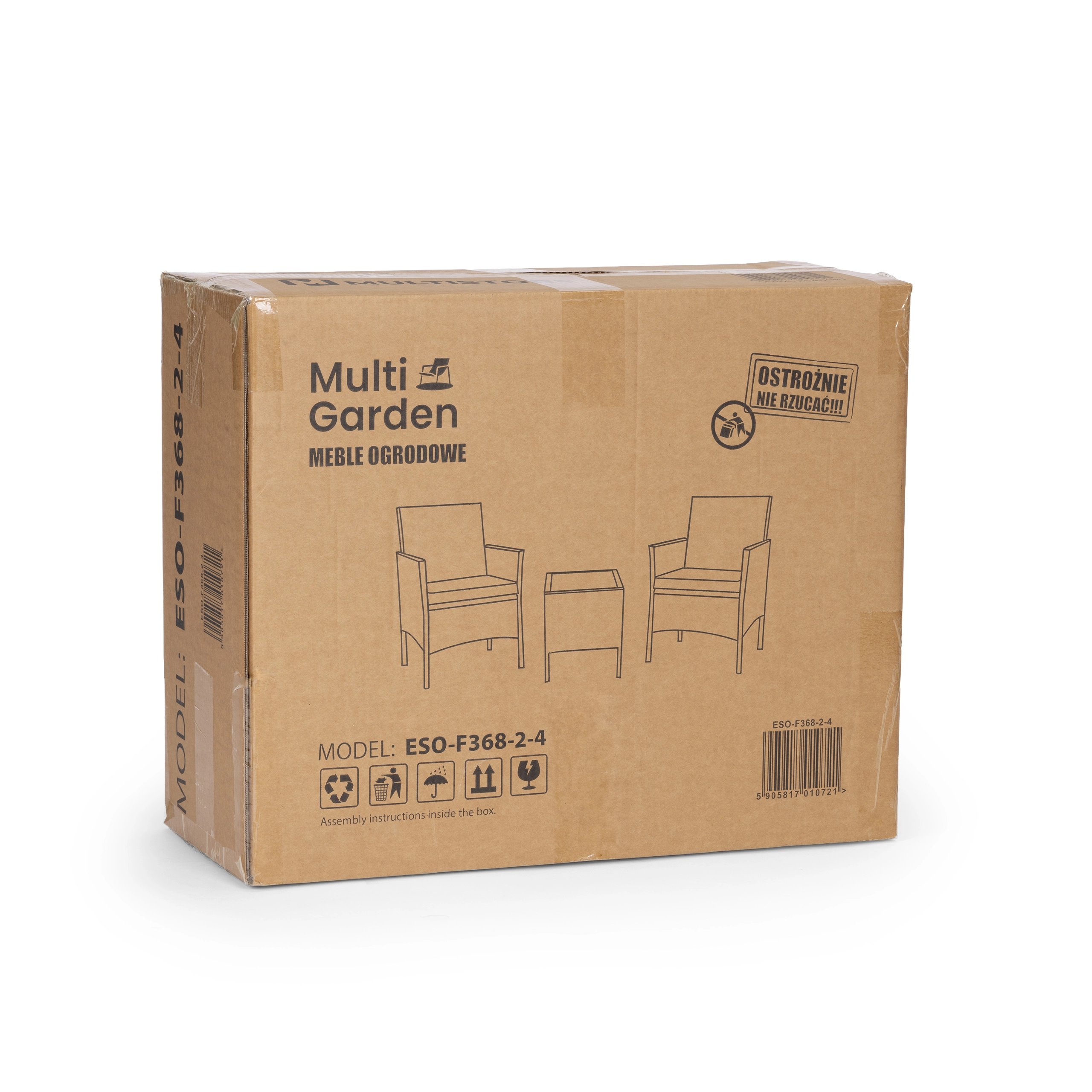 Elegante set da giardino per 2 persone di MultiGarden che combina tecnorattan, una solida struttura in acciaio e un tavolino con vetro temperato. Inclusi cuscini imbottiti in poliestere 160 g/m². L'arredo è resistente alle intemperie, facile da mantenere e perfetto per terrazza, balcone e giardino.