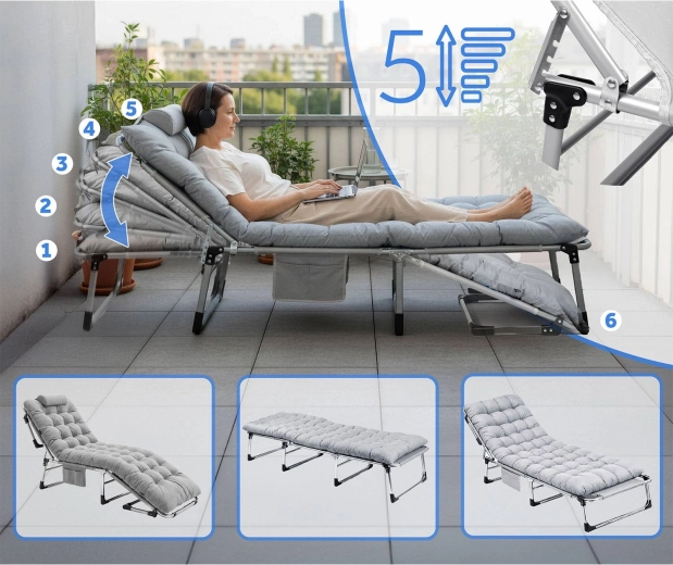 Il lettino pieghevole e brandina da campo ChillWell Dream è progettato per il massimo comfort durante il relax e il sonno. La struttura ergonomica offre un solido supporto a tutto il corpo, mentre la regolazione a 5 posizioni dello schienale e la sezione gambe ribaltabile permettono di scegliere esattamente la postura che preferisci, dal pieno allungamento alla comoda semi-seduta per la lettura.