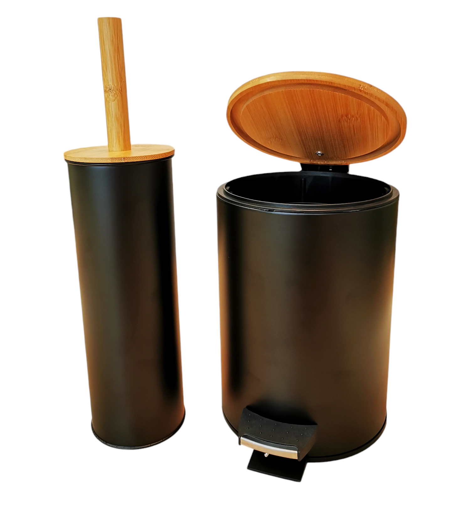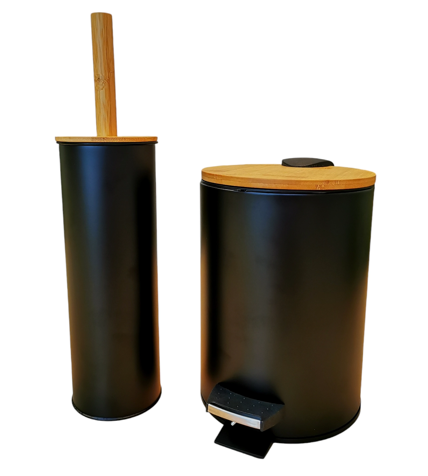 Set da bagno con coperchio in bambù – pattumiera 3 l e scopino WC, nero opaco, soft close