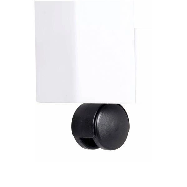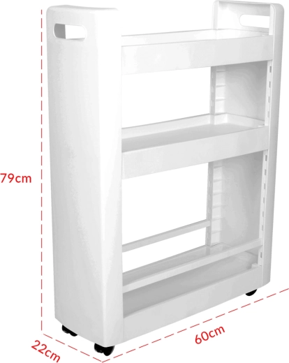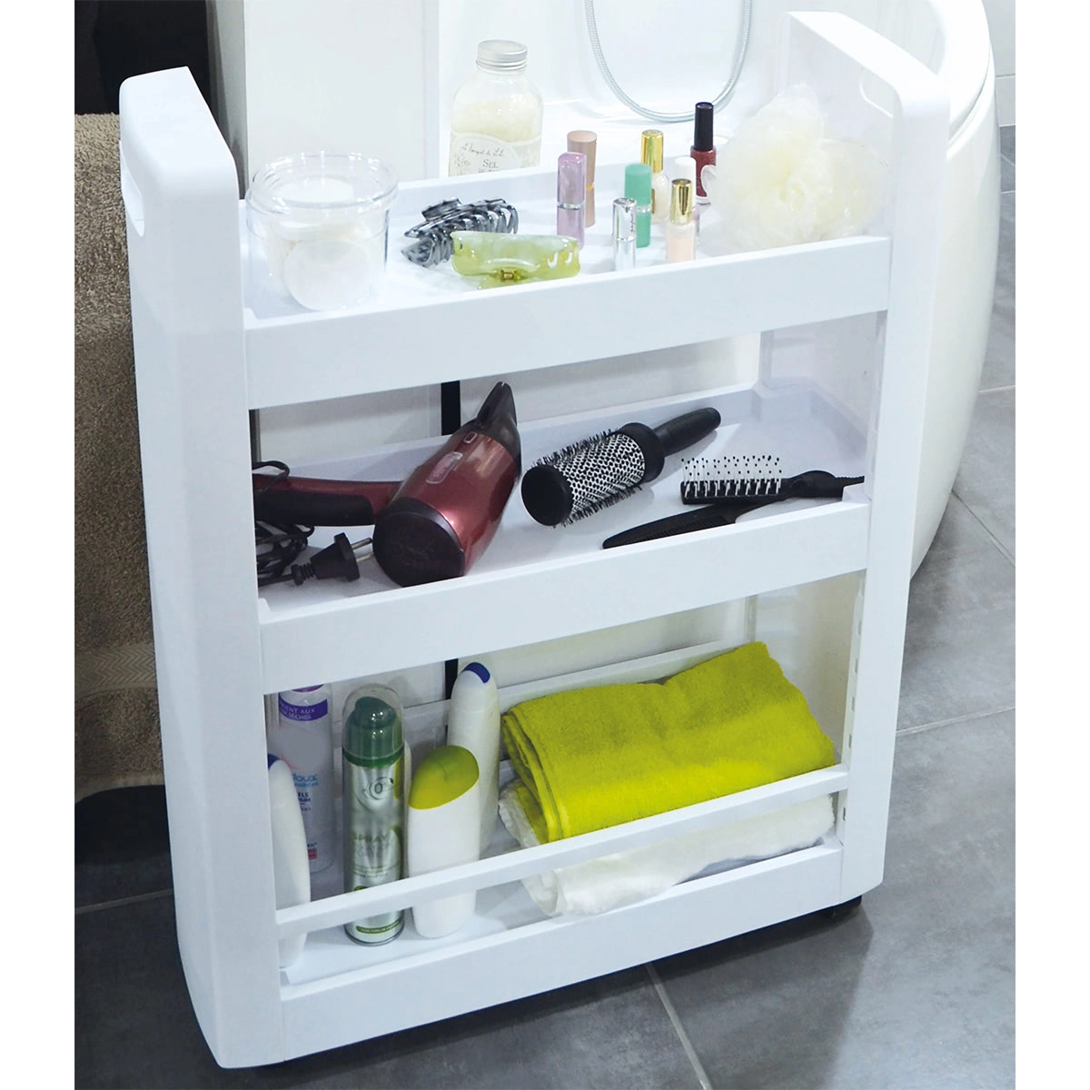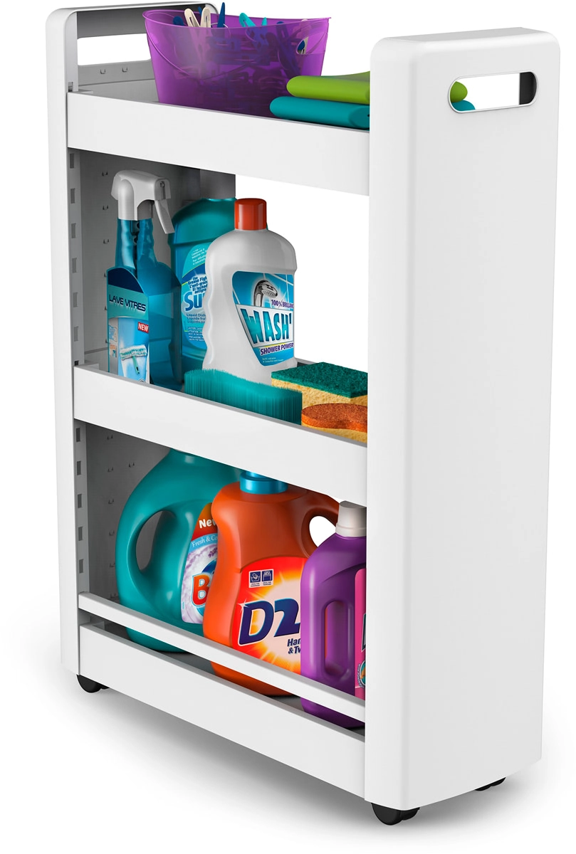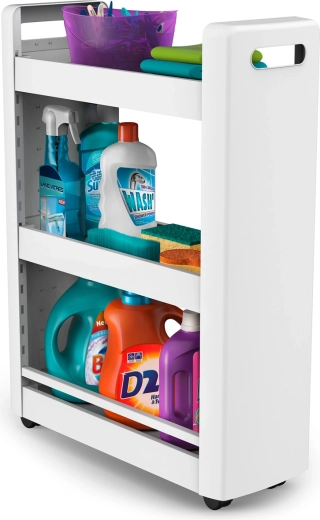 Sfrutta ogni centimetro di spazio. Questo stretto scaffale bianco scivola senza sforzo tra mobili, lavatrice e asciugatrice o sotto un piano alto fino a 80 cm. I ripiani aperti con bordi rialzati mantengono tutto al suo posto, mentre le maniglie integrate e le ruote garantiscono una movimentazione facile.