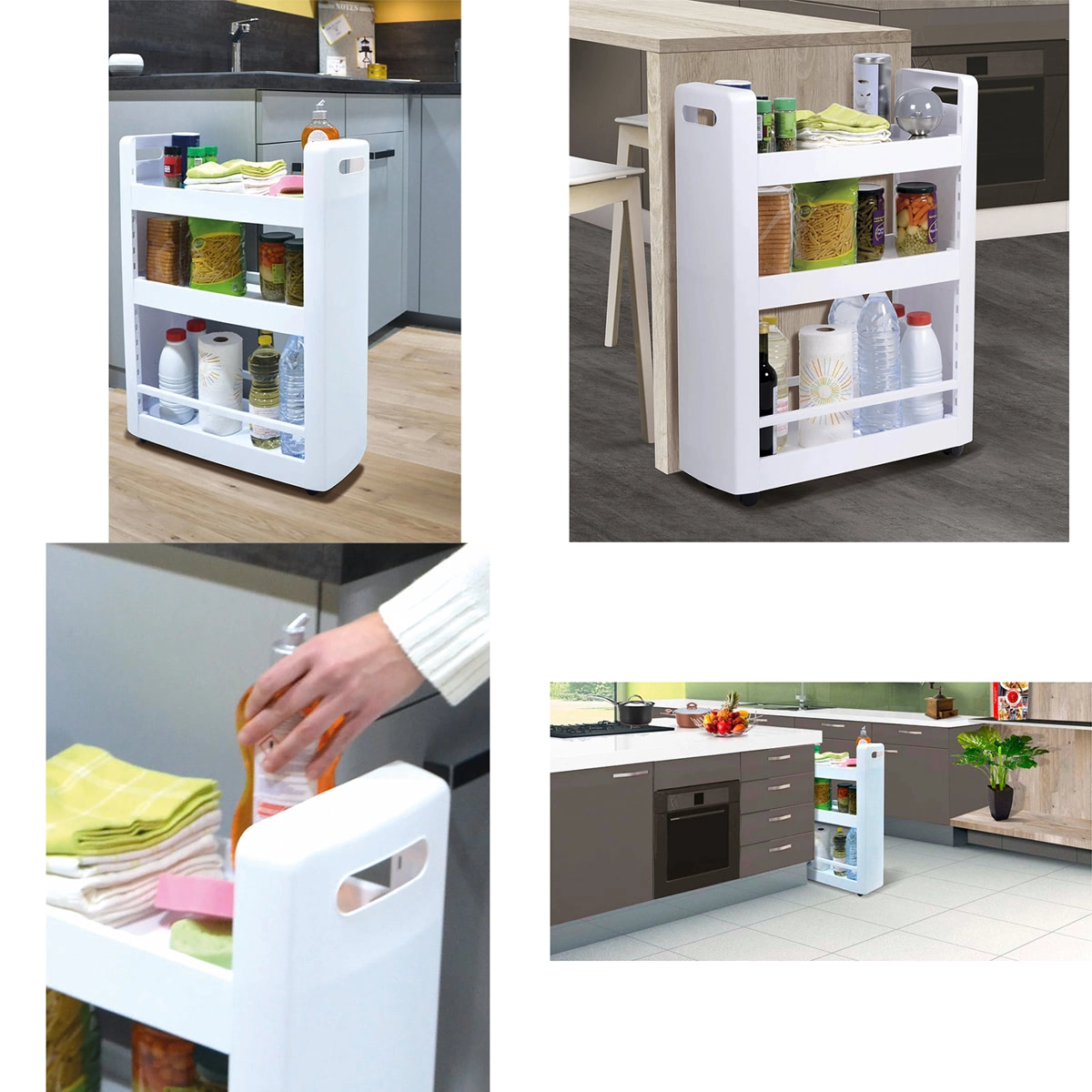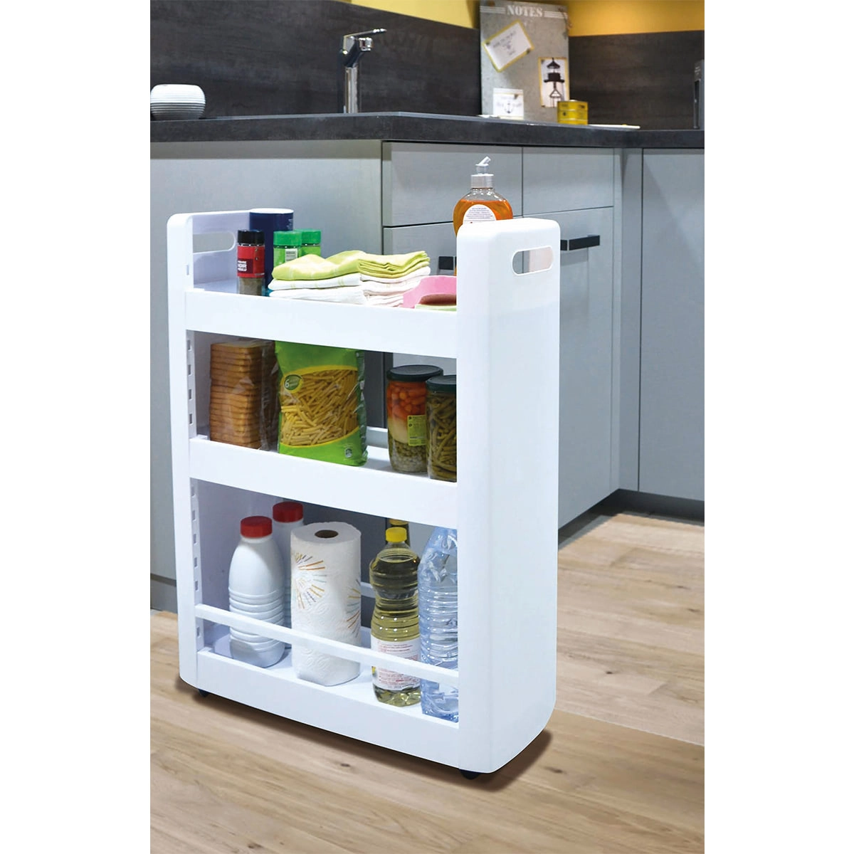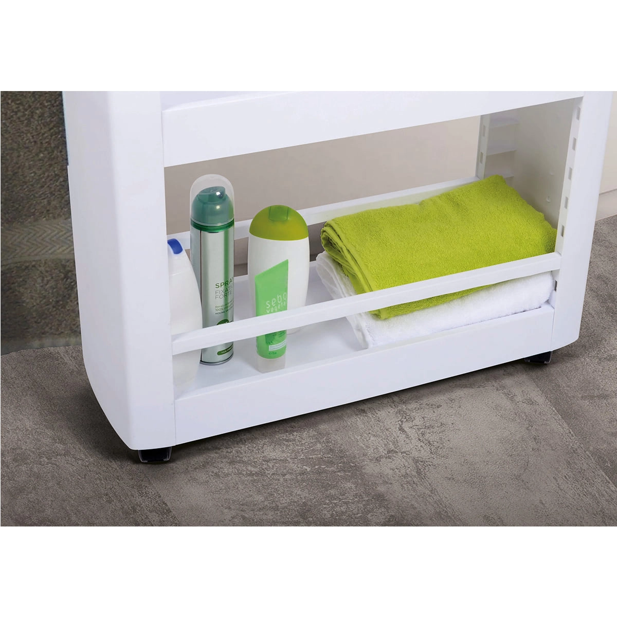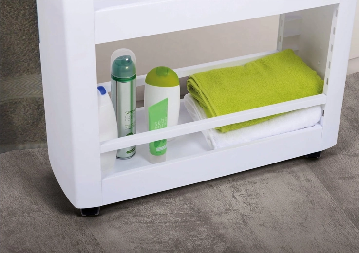 Pratico, stretto e multifunzione, questo scaffale mobile entra anche negli spazi più ridotti e crea subito spazio di archiviazione aggiuntivo. Grazie alle quattro ruote girevoli si estrae facilmente tra elettrodomestici o mobili, e i ripiani regolabili si adattano alle tue esigenze in cucina, bagno e lavanderia.