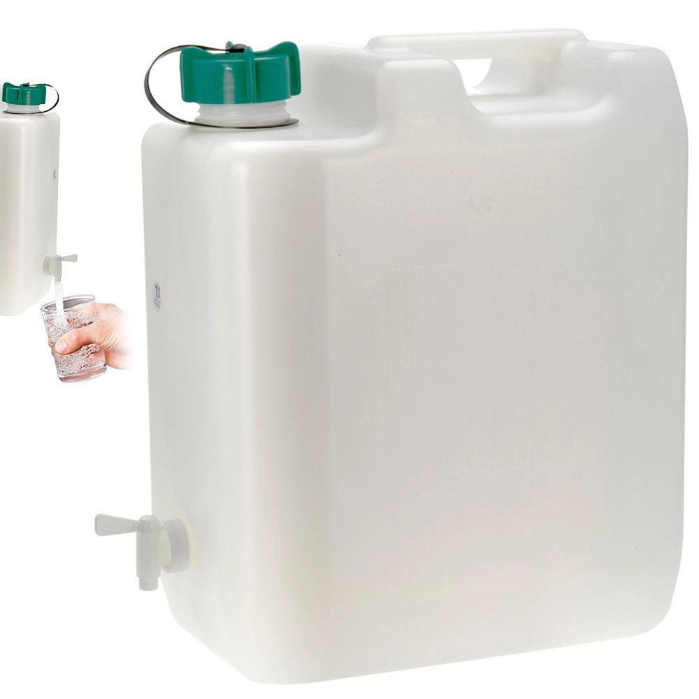 Pratica tanica per acqua con capacità di 35 l, dotata di maniglia robusta per un facile trasporto e rubinetto integrato per un dosaggio preciso. Ideale per viaggi, campeggio e uso domestico. Realizzata in materiale idoneo al contatto con alimenti.