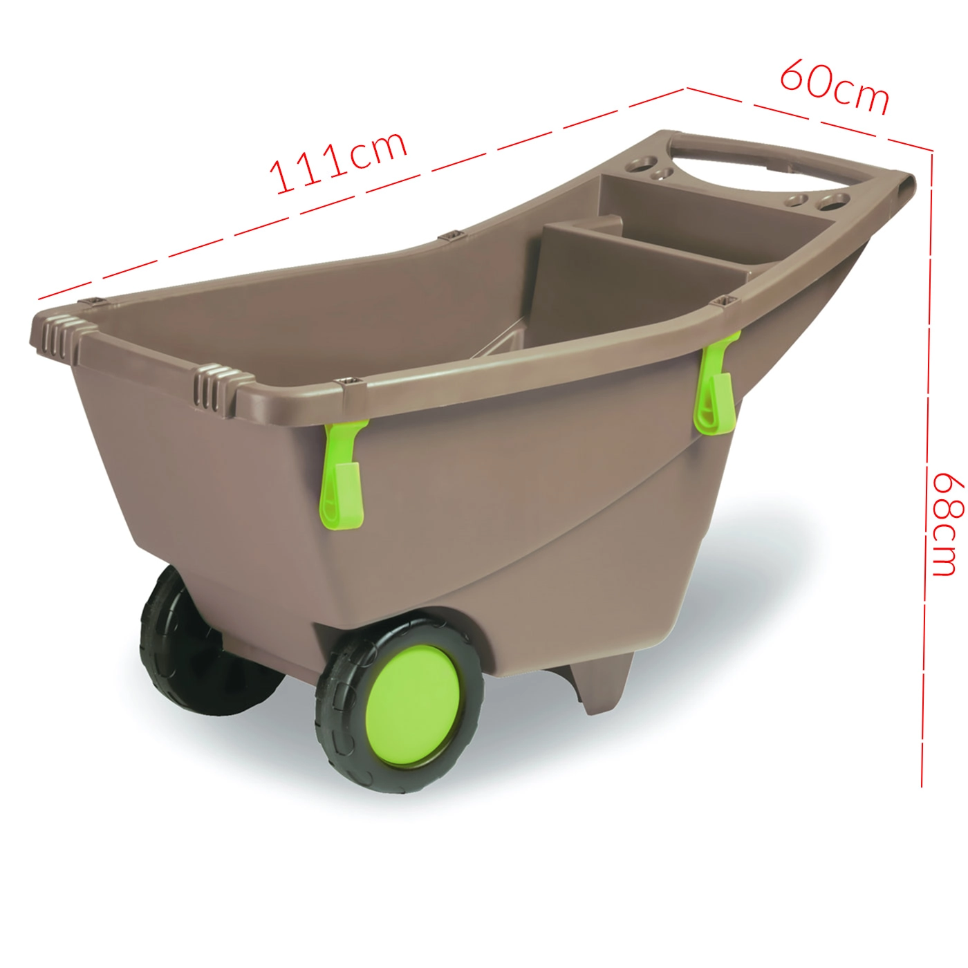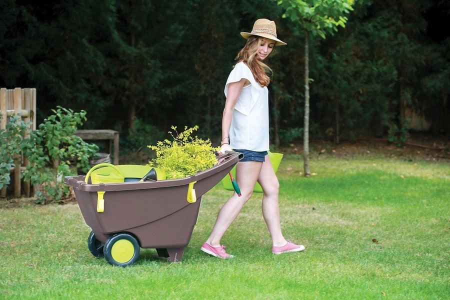 All’interno della vasca è integrato un pratico ripiano per il trasporto di piantine o piccoli attrezzi. Due anelli di fissaggio laterali permettono il trasporto sicuro degli attrezzi da giardino. Il materiale in polipropilene resistente si pulisce facilmente e richiede una manutenzione minima. La carriola viene fornita già assemblata, così puoi metterti subito al lavoro.