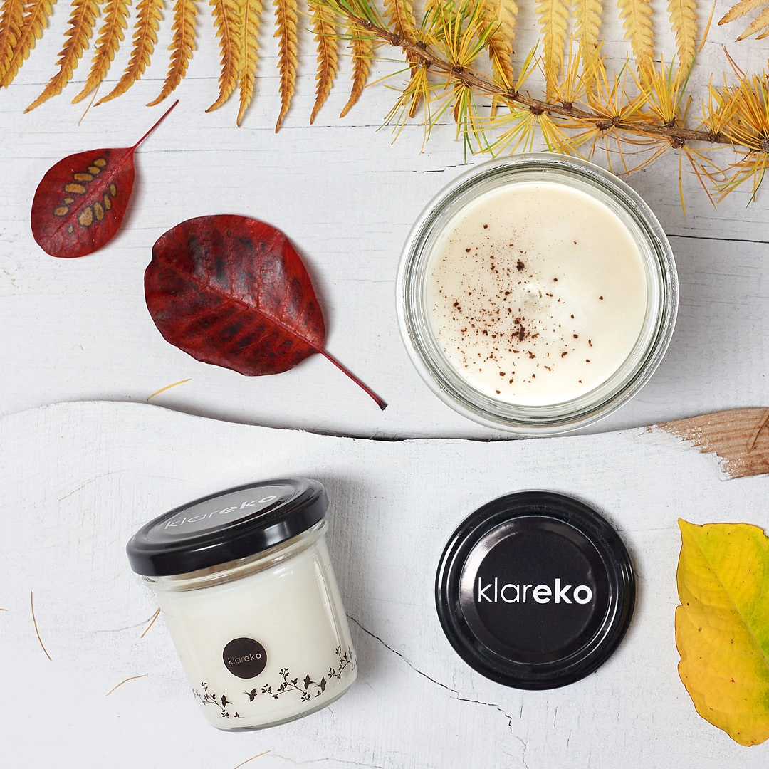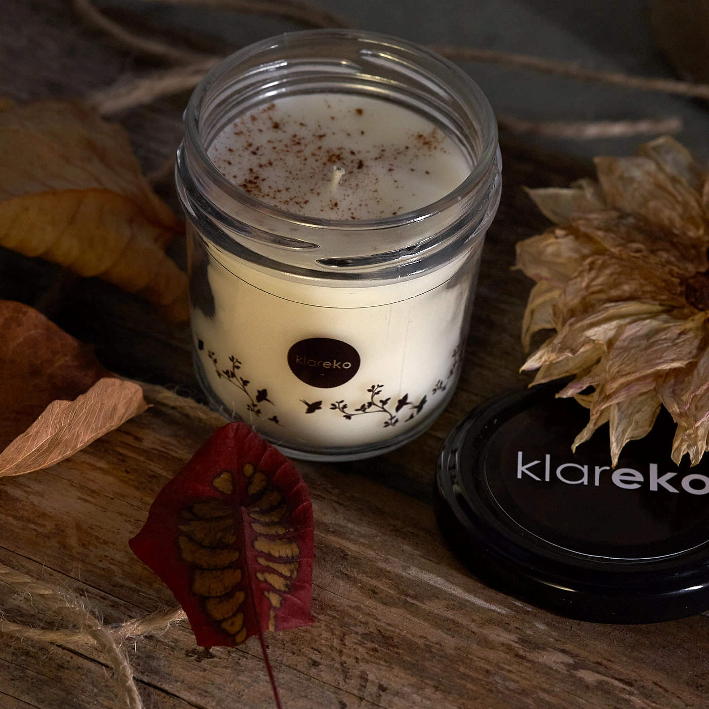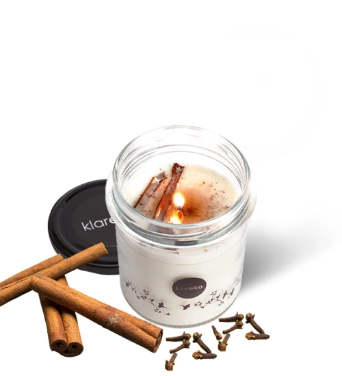 Goditi un'atmosfera accogliente con la candela profumata naturale KLAREKO in cera di soia al profumo di cannella e chiodi di garofano. Realizzata a mano, ecologica, vegana e atossica, la candela brucia per circa 22 ore, non produce fumo né tossine e avvolge la casa con un profumo piacevole e duraturo.