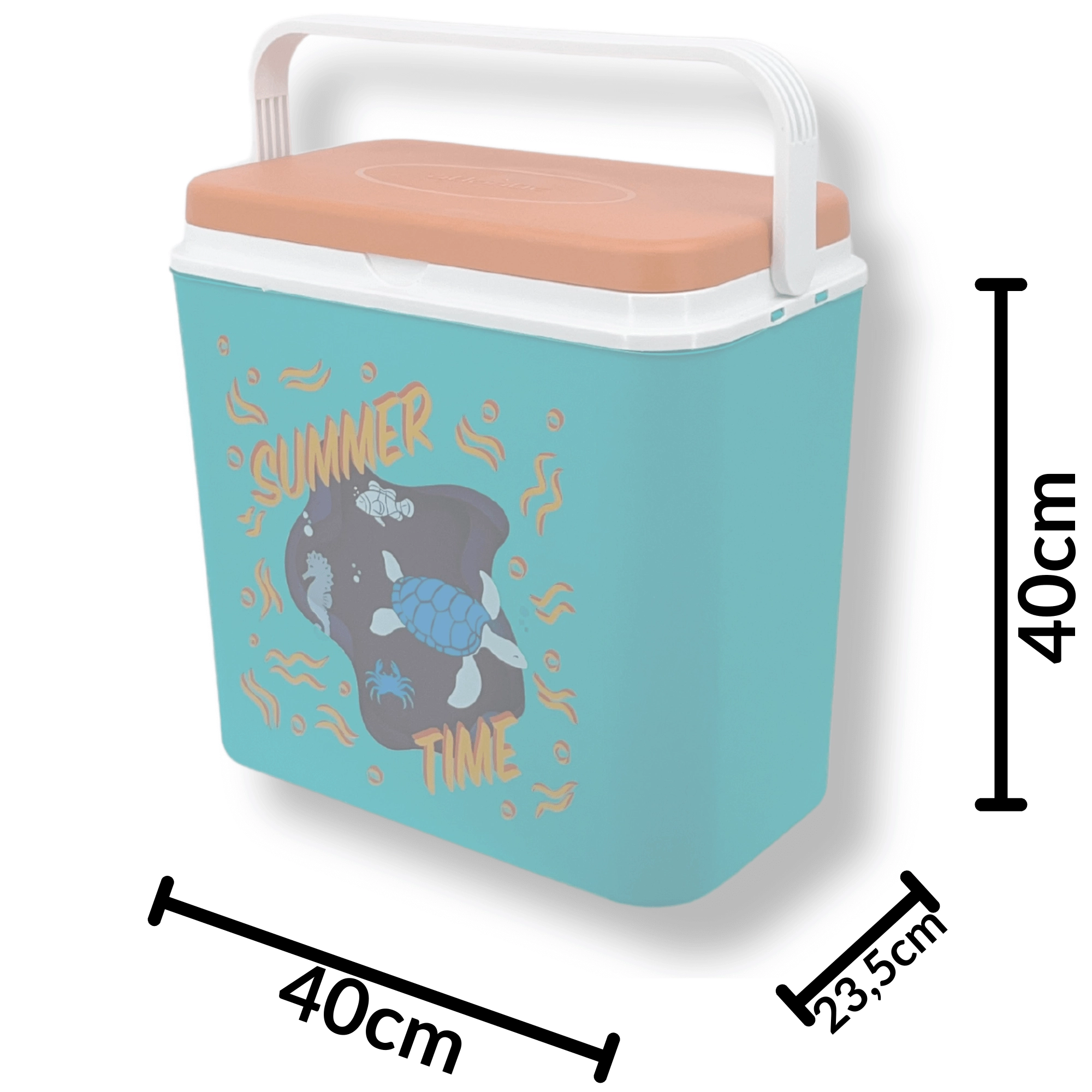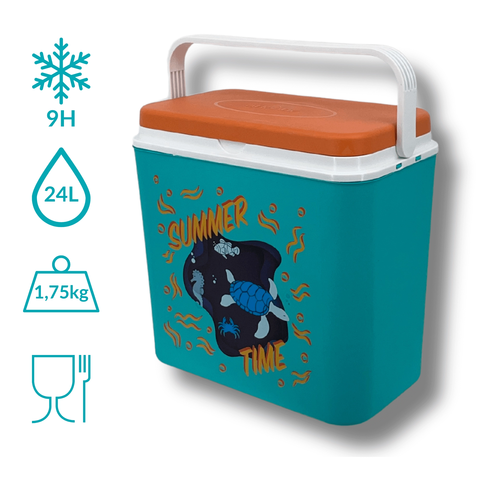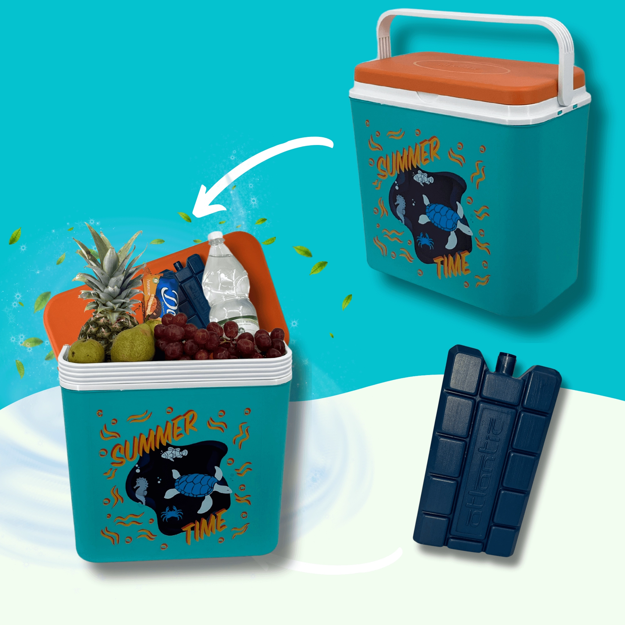 La box in resistente polipropilene è facile da pulire e la sua struttura compatta entra in auto, camper e barca. L'altezza interna consente di posizionare una bottiglia da 2 l in verticale; all'interno entrano fino a otto bottiglie da 1,5 l oppure tre da 2 l affiancate. La stampa estiva con tartaruga e cavalluccio marino e il coperchio a contrasto donano un aspetto accattivante.
