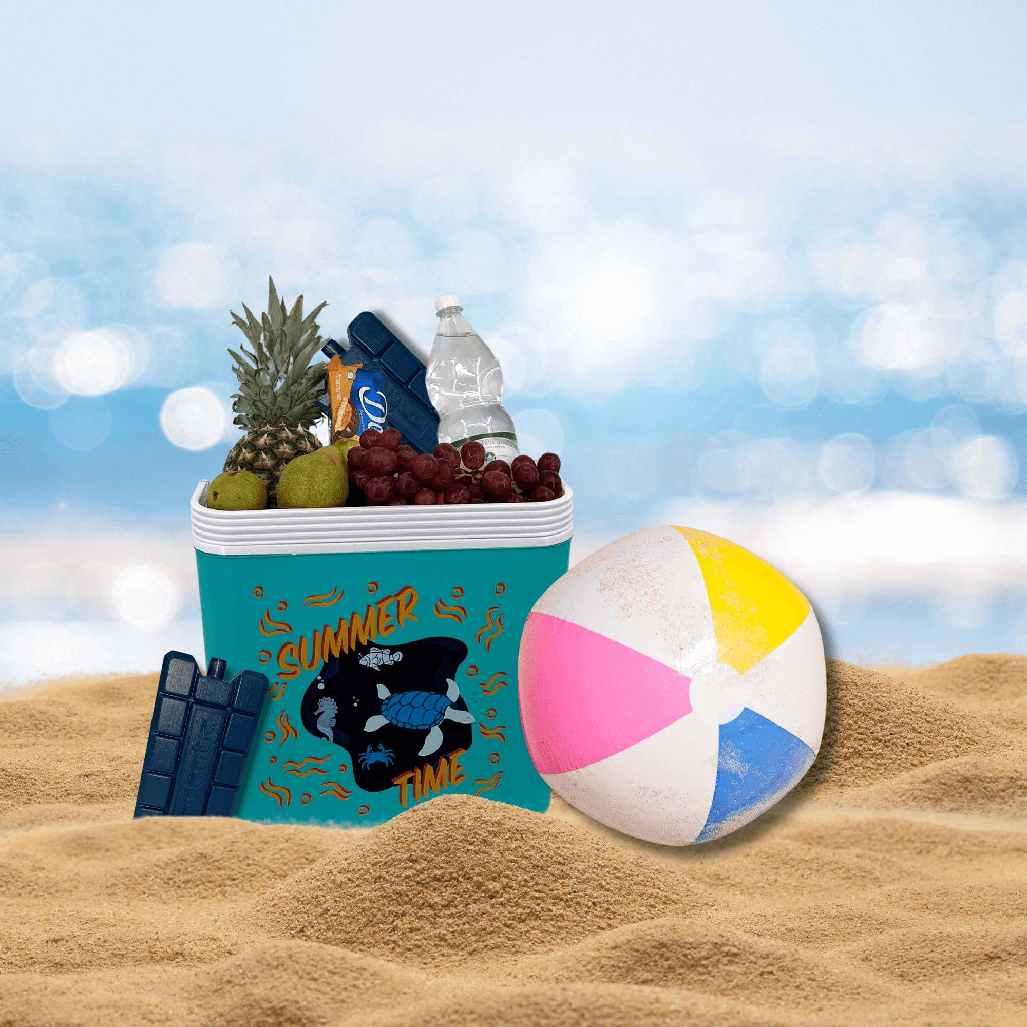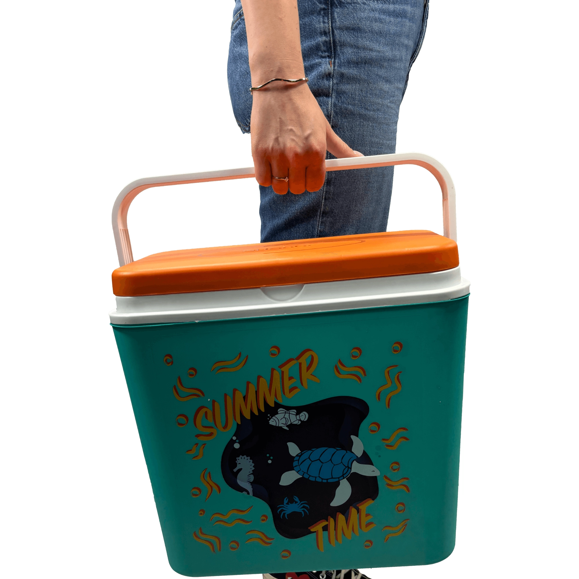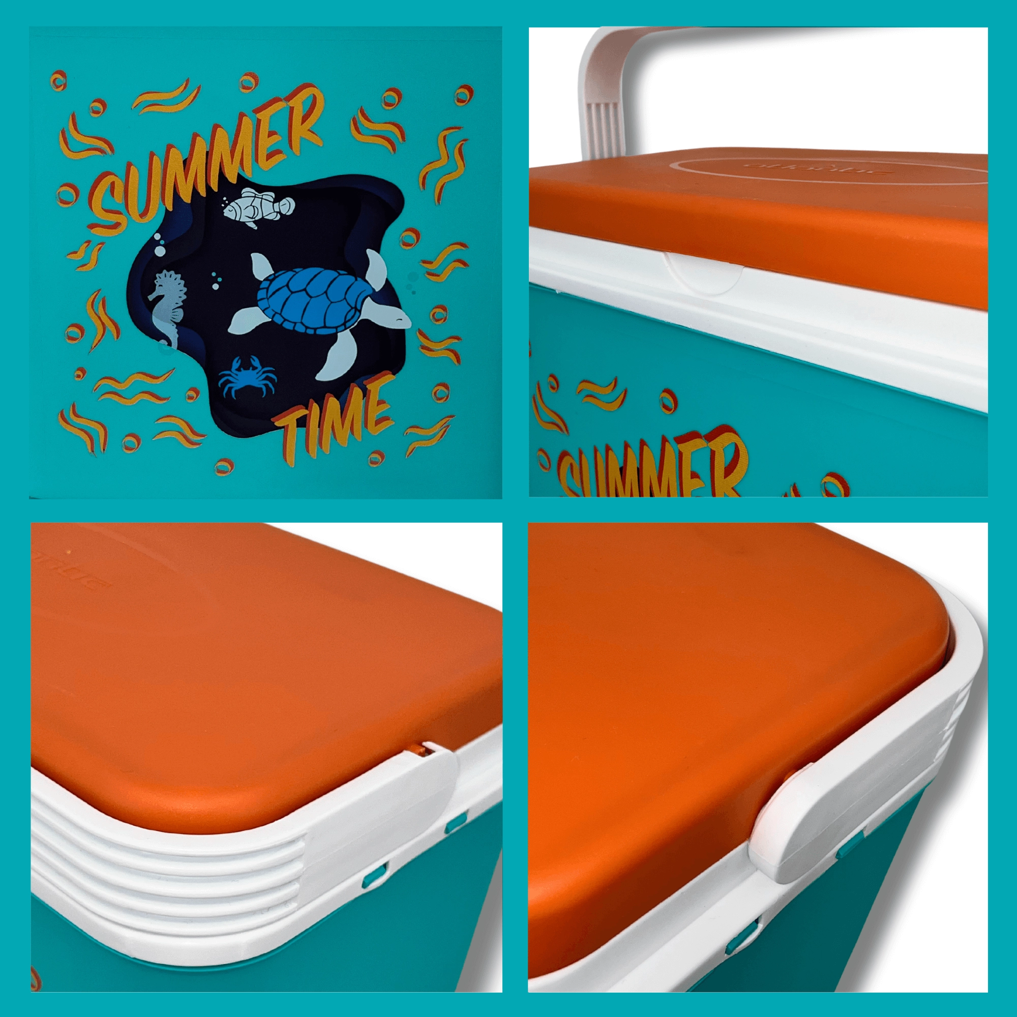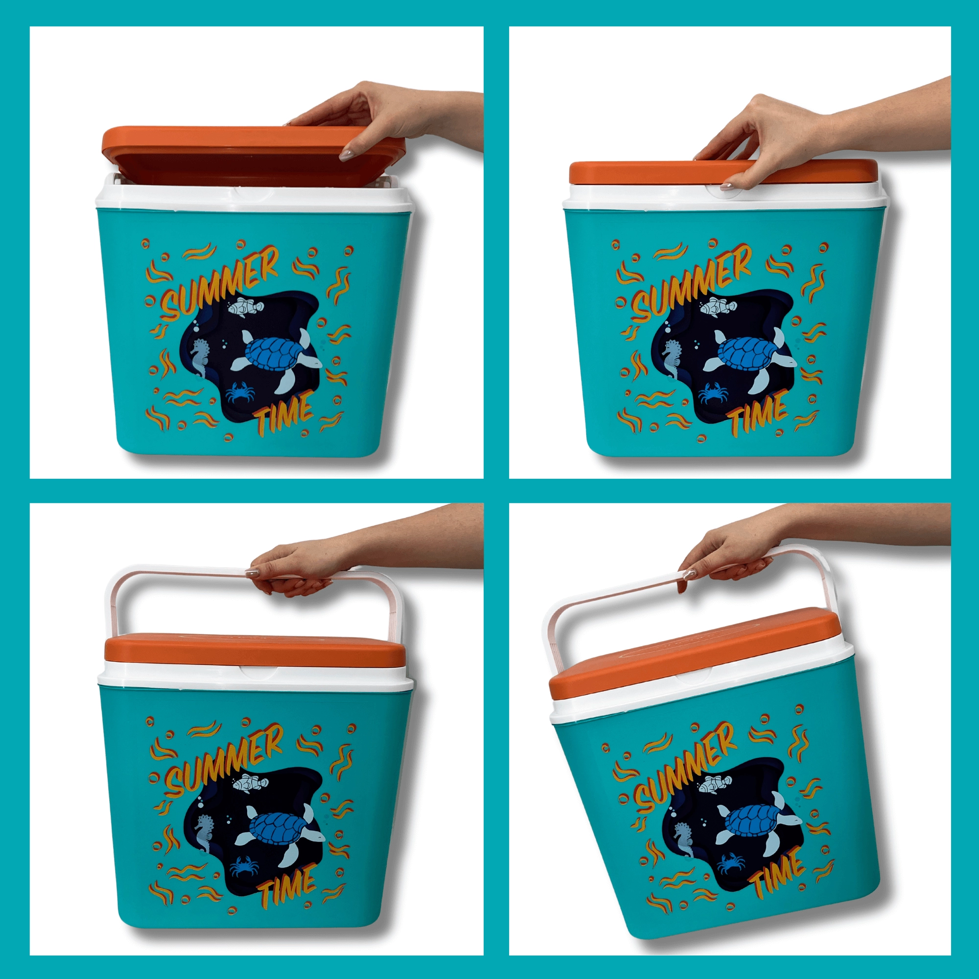 La box in resistente polipropilene è facile da pulire e la sua struttura compatta entra in auto, camper e barca. L'altezza interna consente di posizionare una bottiglia da 2 l in verticale; all'interno entrano fino a otto bottiglie da 1,5 l oppure tre da 2 l affiancate. La stampa estiva con tartaruga e cavalluccio marino e il coperchio a contrasto donano un aspetto accattivante.