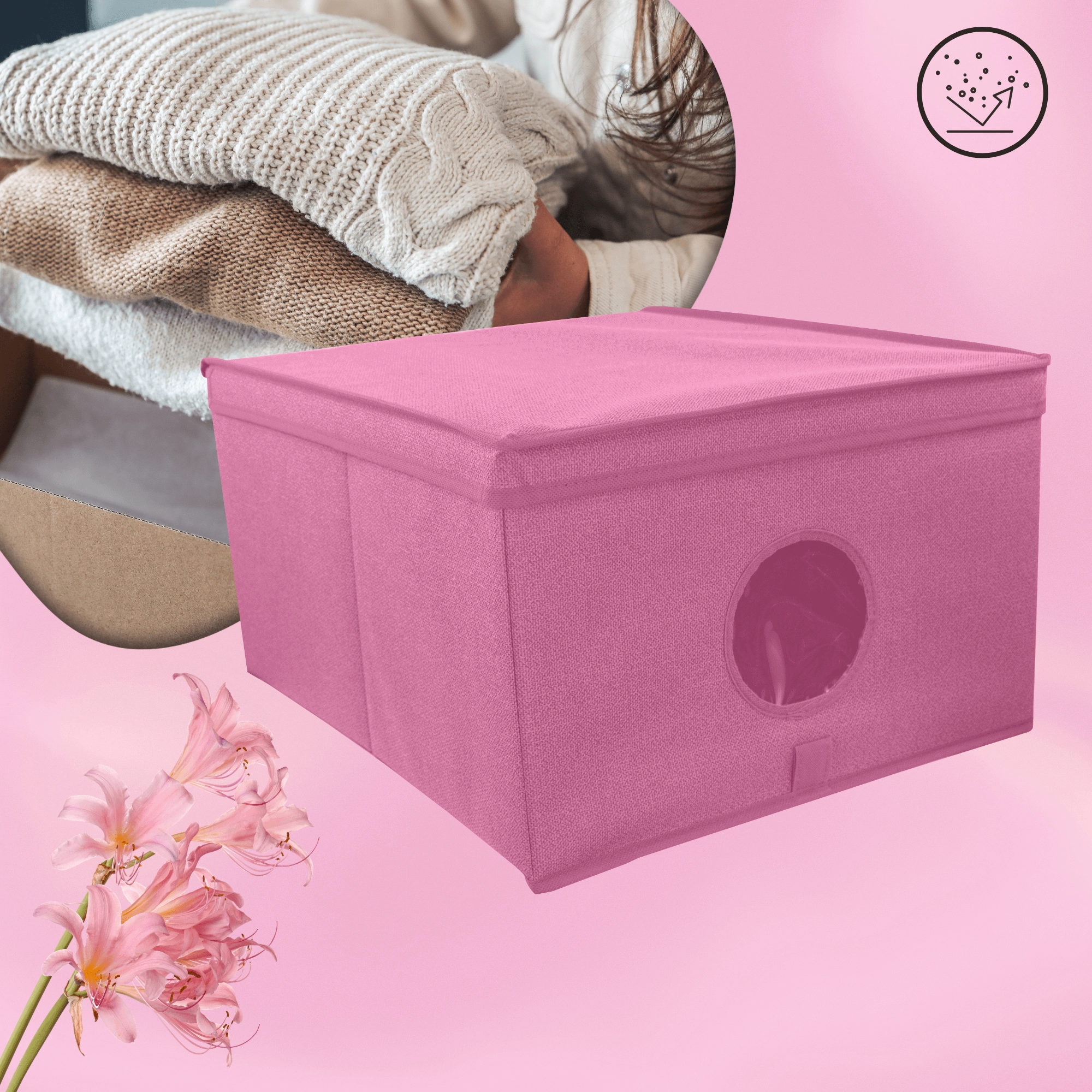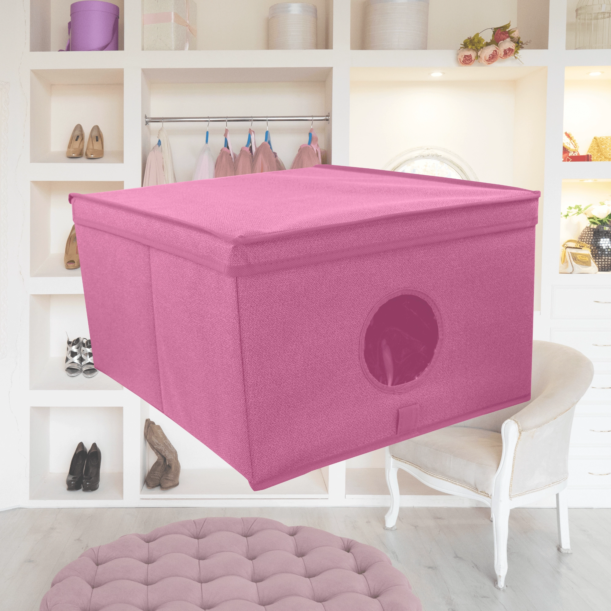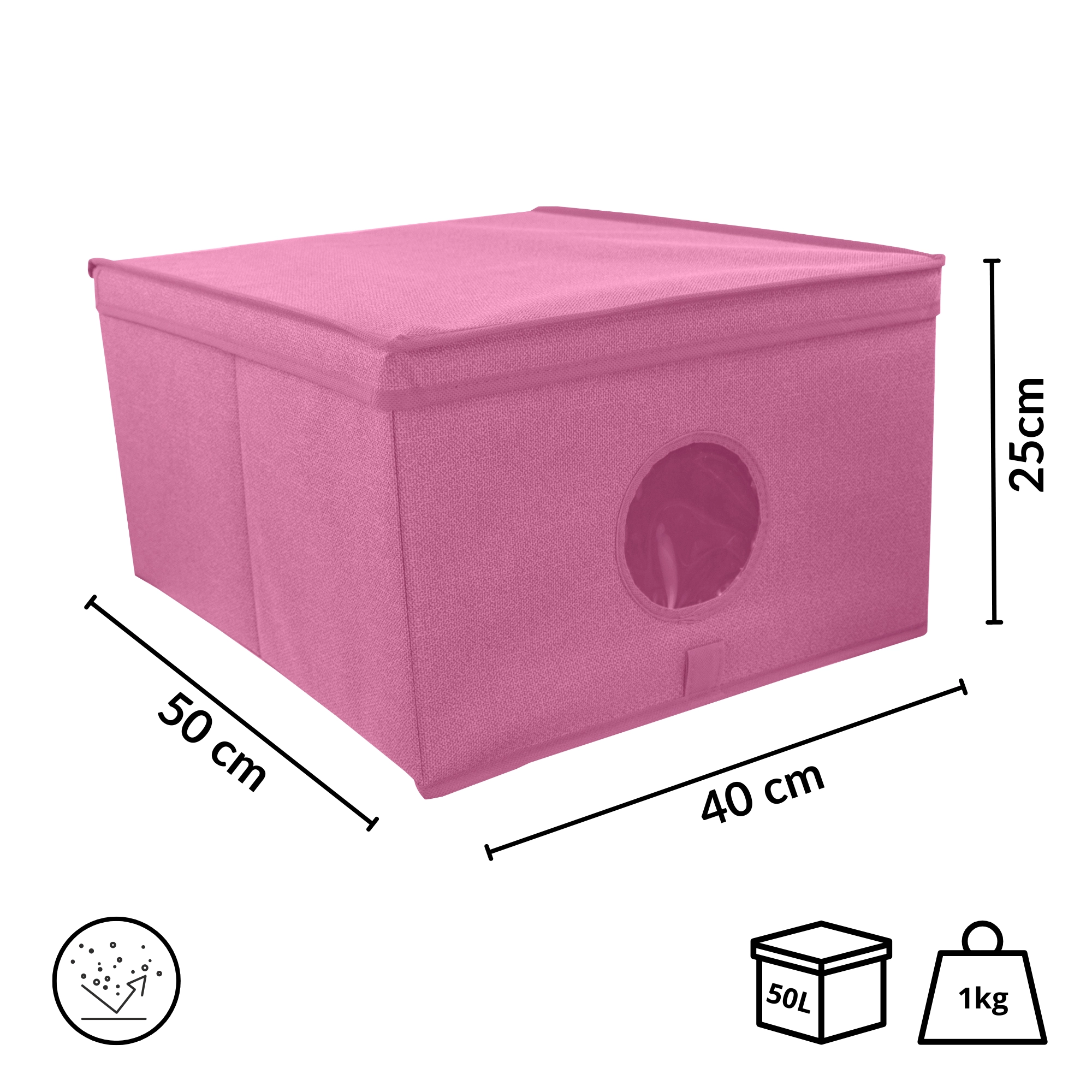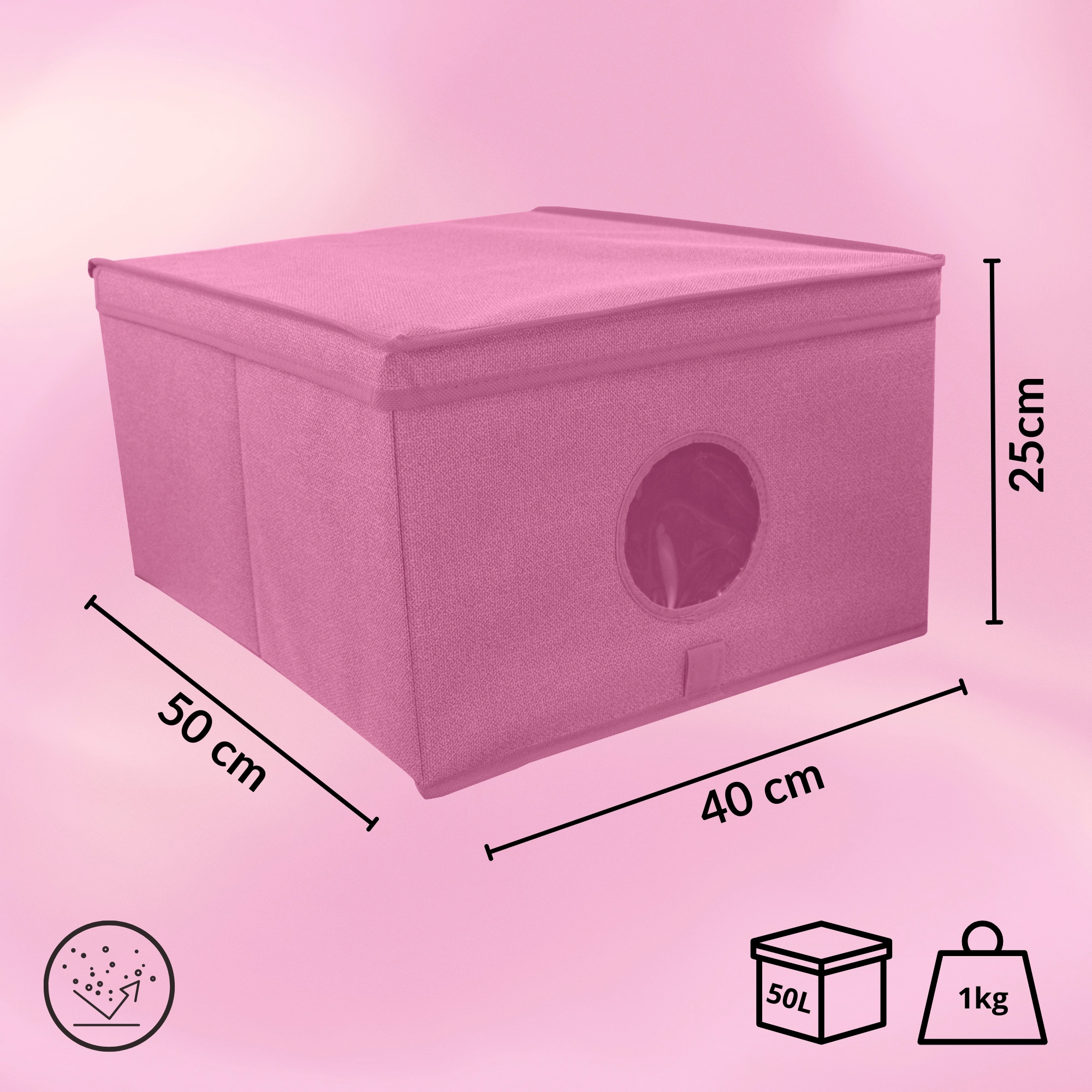 Mantieni l'armadio e la casa perfettamente in ordine con questa scatola portaoggetti rosa con coperchio e finestra trasparente. Grazie alle dimensioni 50 × 40 × 25 cm, ospita comodamente abiti, biancheria da letto, giocattoli e accessori. La finestra trasparente permette di controllare rapidamente il contenuto, il coperchio protegge dalla polvere e la struttura pieghevole fa risparmiare spazio quando non utilizzi la scatola.