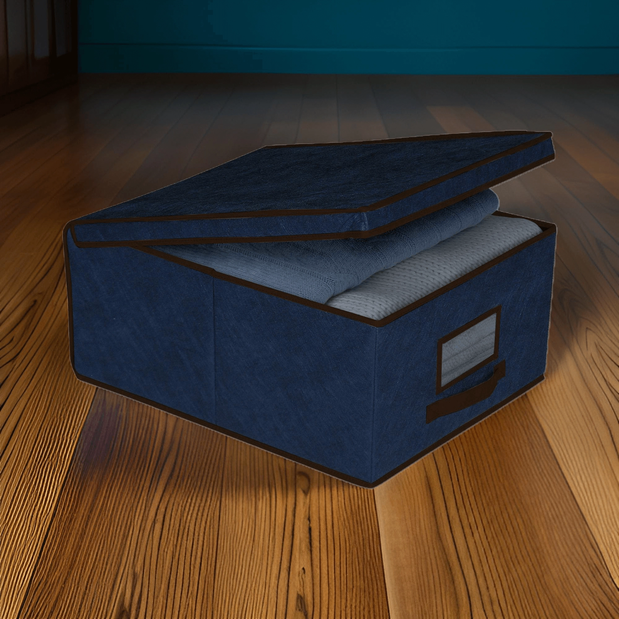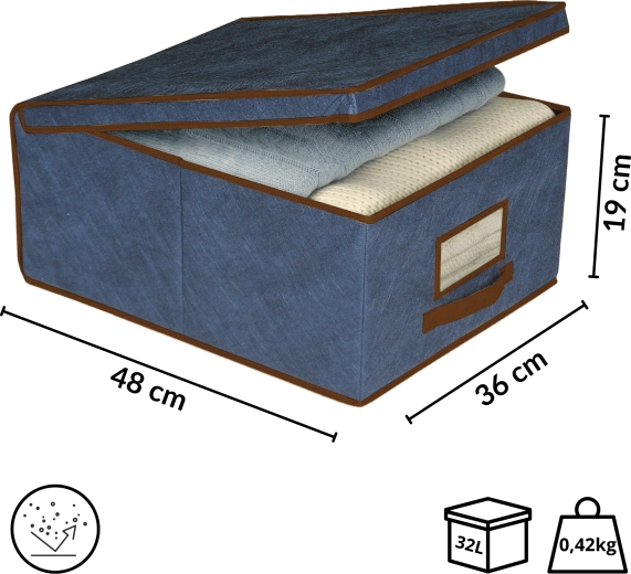 Grazie alla solida maniglia frontale, il box si estrae facilmente dalla mensola o dai ripiani alti dell’armadio. È ideale per riporre abiti stagionali, biancheria da letto, coperte, maglioni, giocattoli e accessori. L’elegante blu scuro con bordo discreto si adatta a qualsiasi interno.
