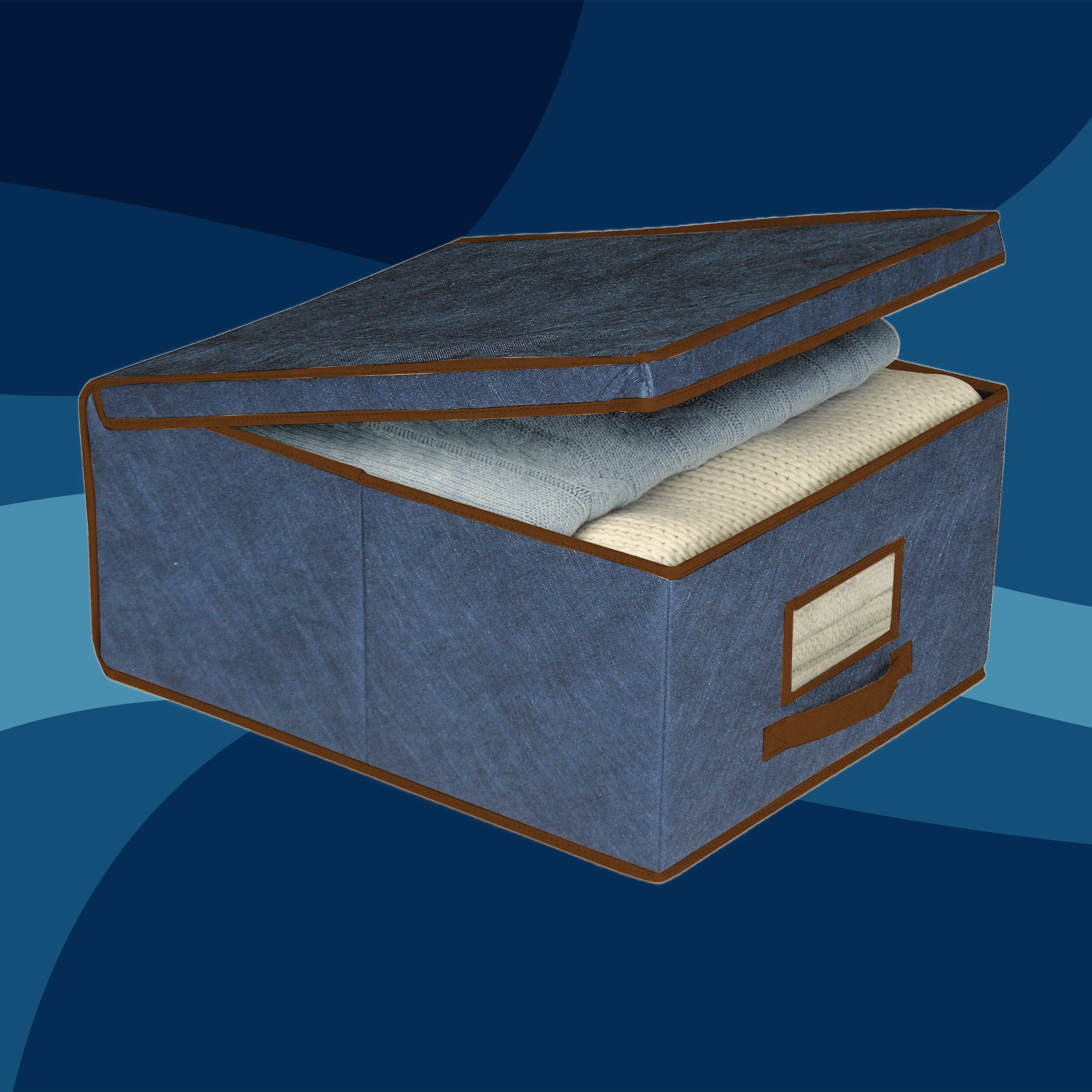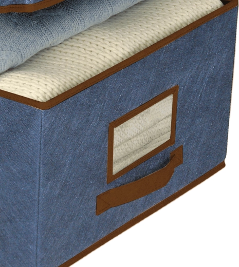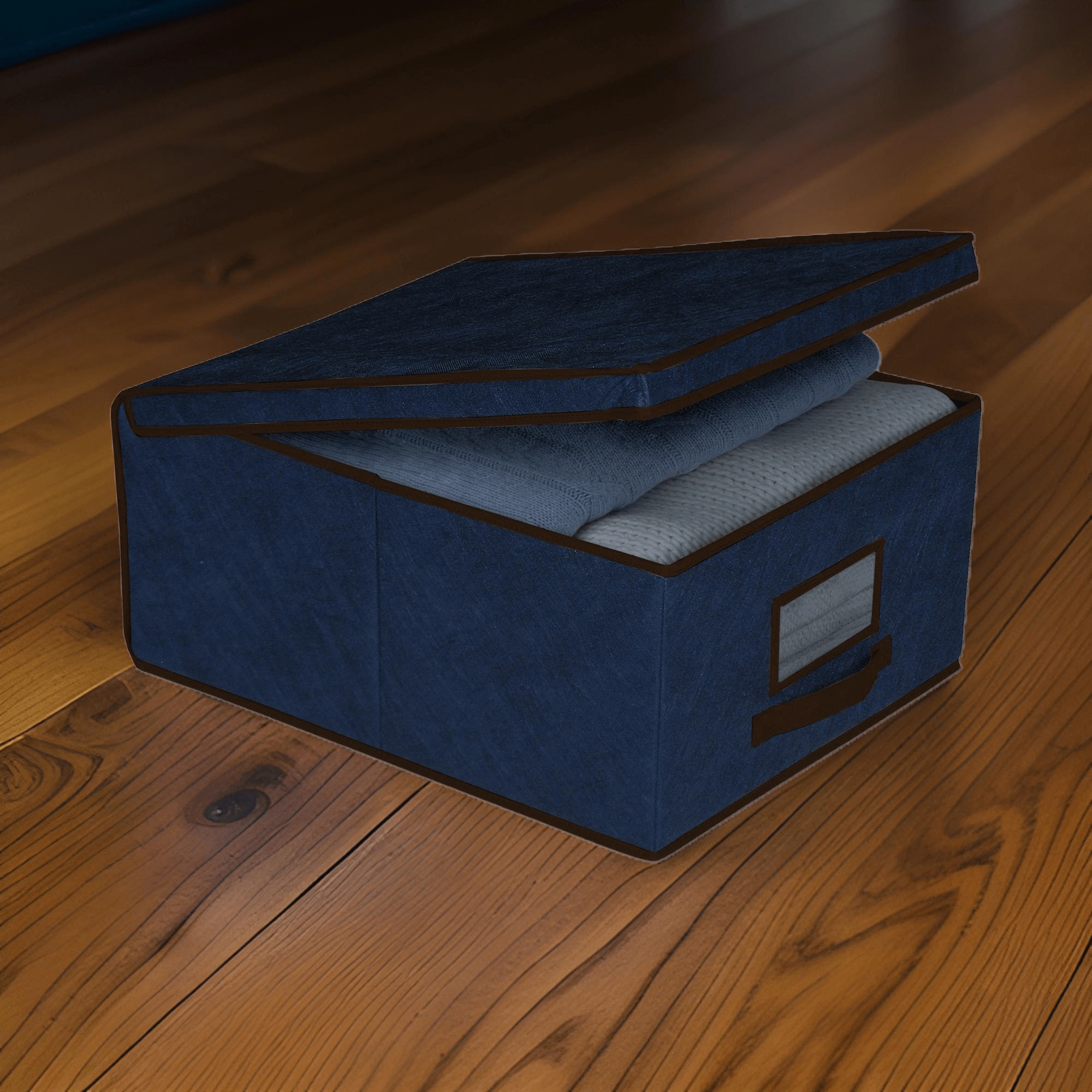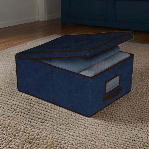 La scatola portaoggetti blu è ideale per riporre in modo ordinato abiti, biancheria da letto, maglioni, giocattoli e accessori. La struttura pieghevole ma resistente in tessuto non tessuto mantiene la forma e non occupa spazio quando non la si usa.