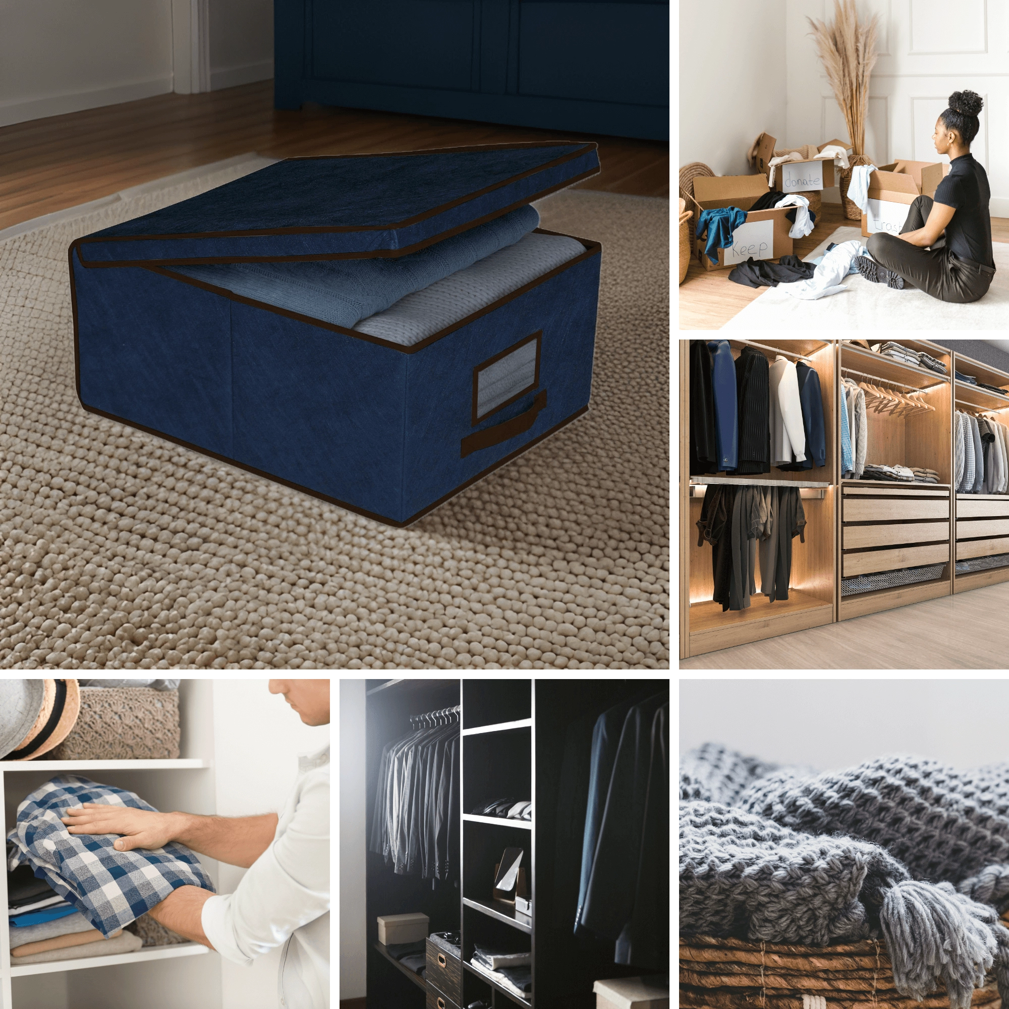 Il coperchio rigido protegge i tessili riposti dalla polvere e mantiene l’armadio ordinato anche impilando più scatole.