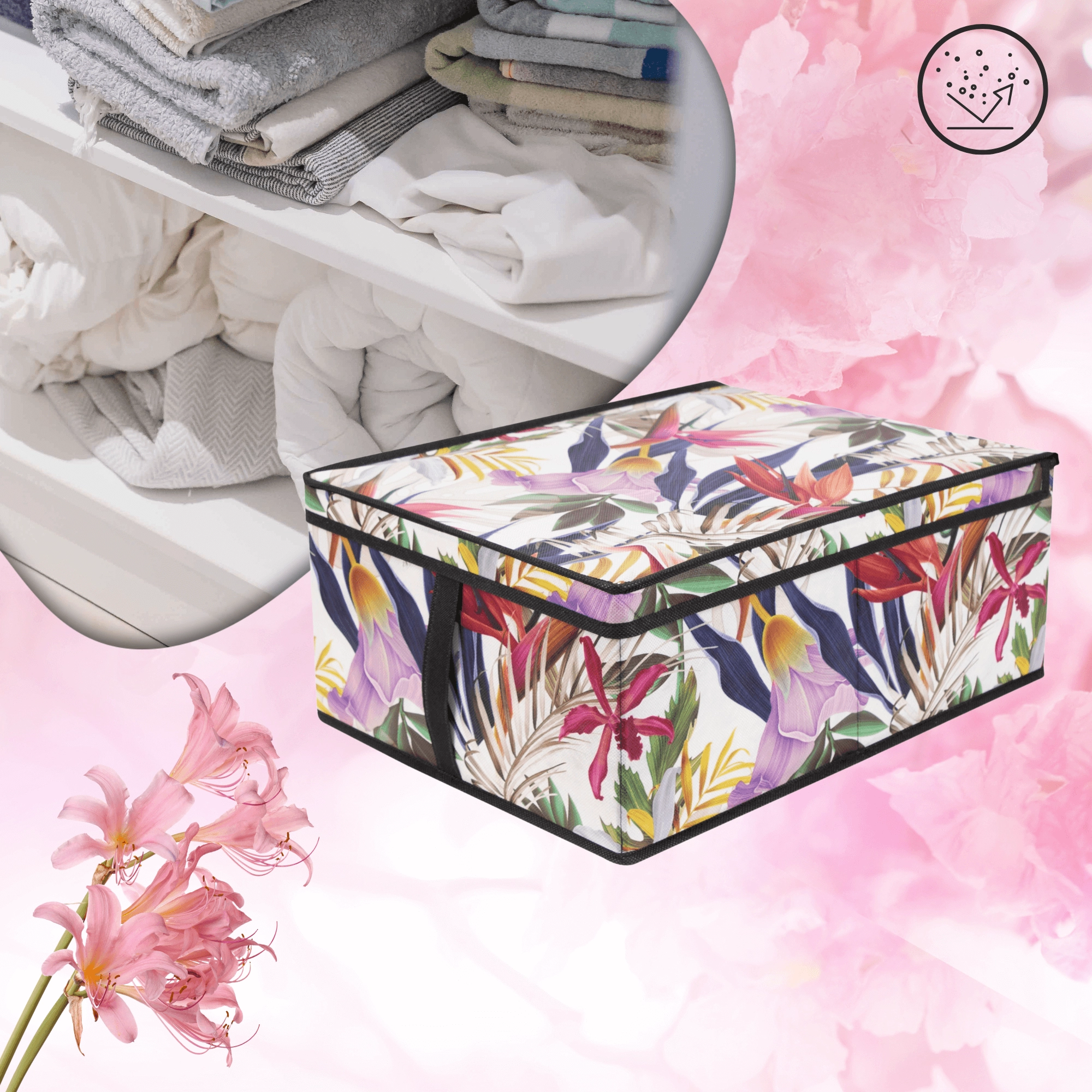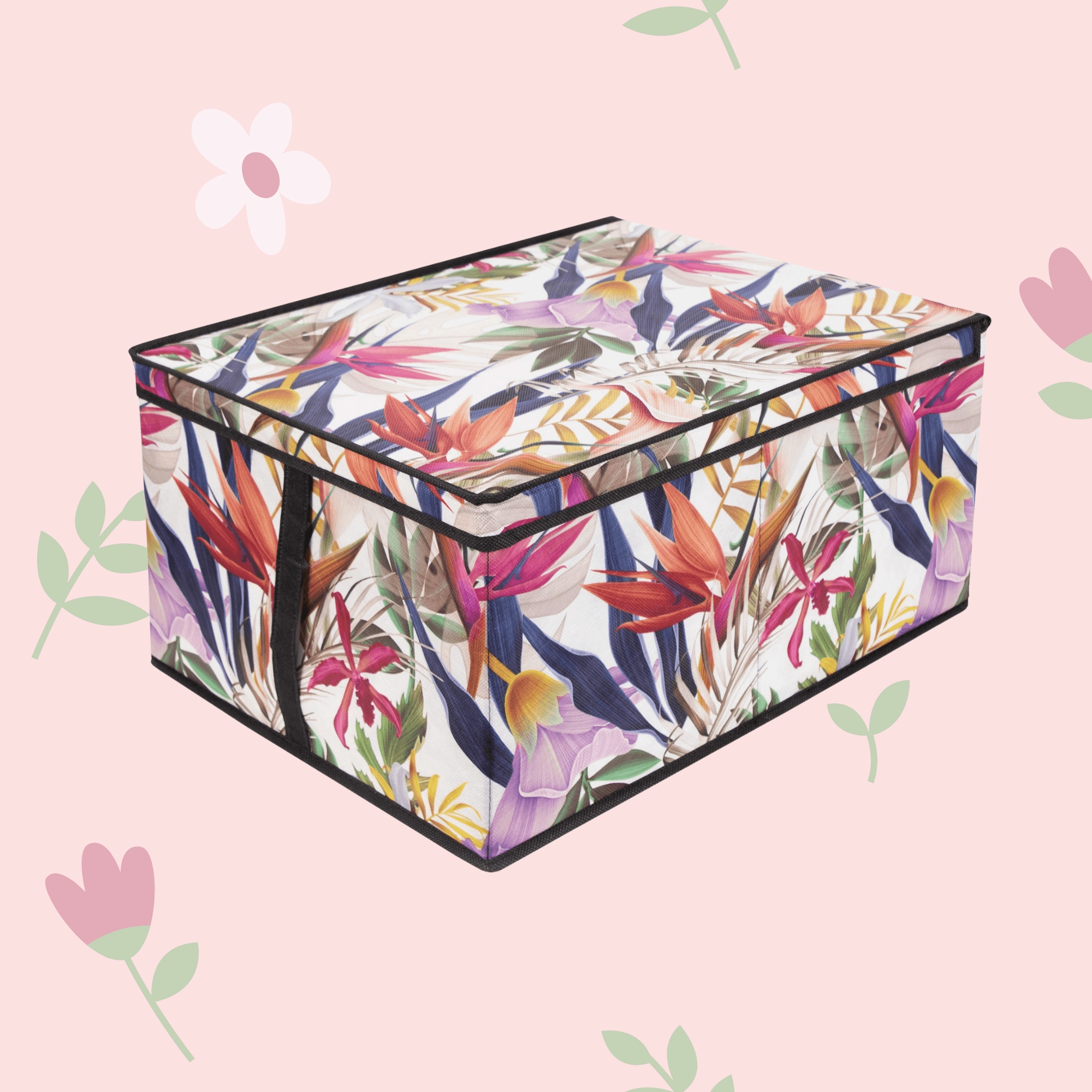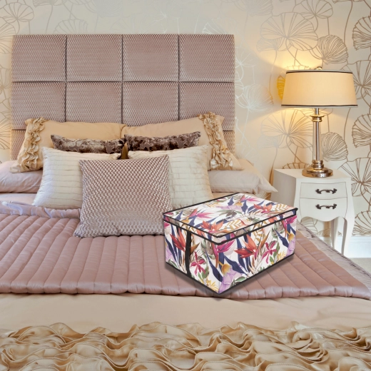 Il vivace motivo tropicale con bordatura nera trasforma una semplice sistemazione in una decorazione di stile. La scatola sta benissimo su mensole, in armadio e anche sotto il letto.