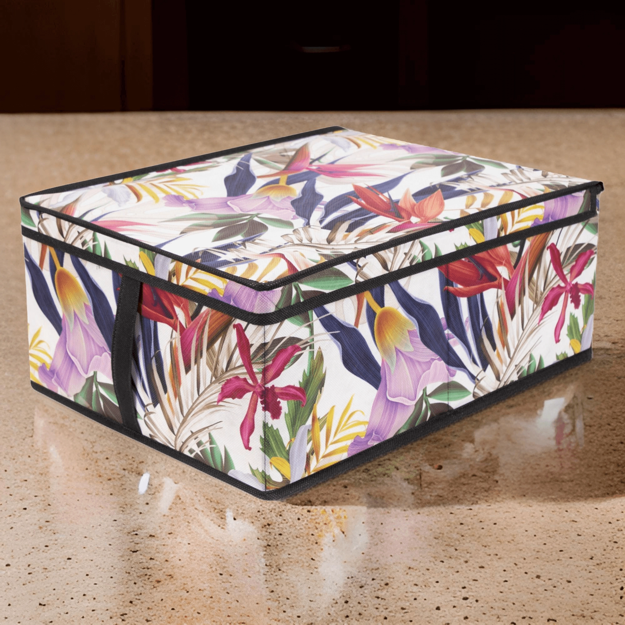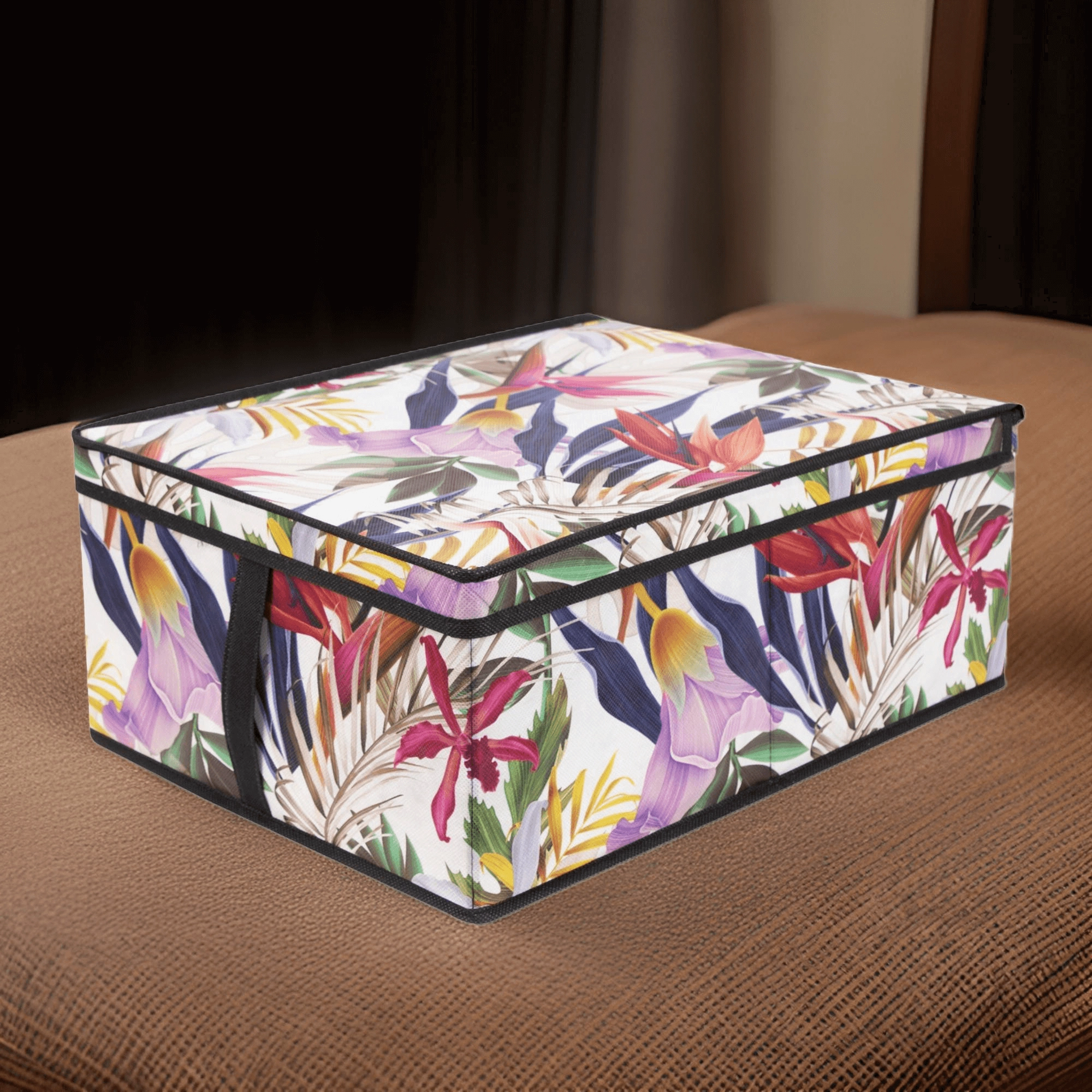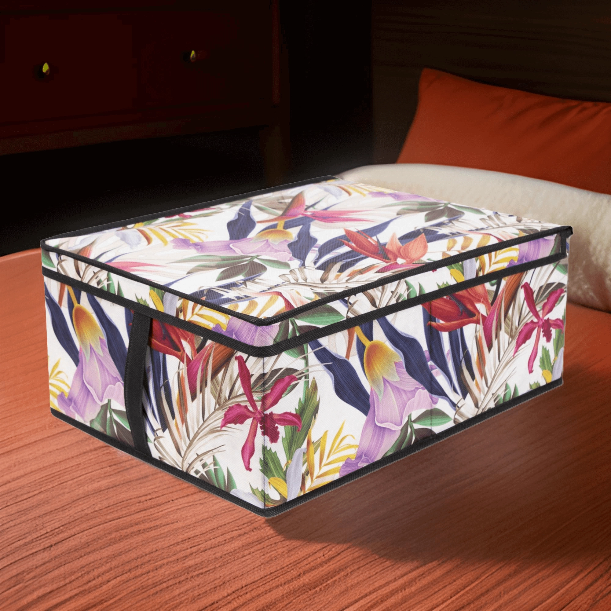 Il vivace motivo tropicale con bordatura nera trasforma una semplice sistemazione in una decorazione di stile. La scatola sta benissimo su mensole, in armadio e anche sotto il letto.