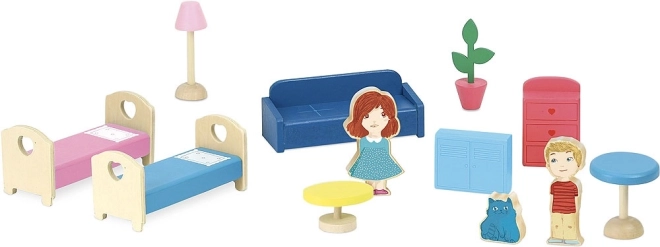 Il set comprende una serie di mobili in legno e figure, compresi il letto, il divano e piccole figure animali. I bambini possono così creare scene domestiche in miniatura.