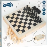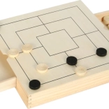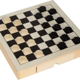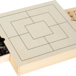 Questo elegante set in legno offre tre classici giochi strategici in uno: scacchi, dama e mulino. Grazie alle dimensioni compatte 28 × 28 × 4 cm e ai cassetti integrati è ideale sia in viaggio che a casa. Ogni pezzo ha il suo posto, così non si perde nulla e la partita può iniziare in pochi secondi.