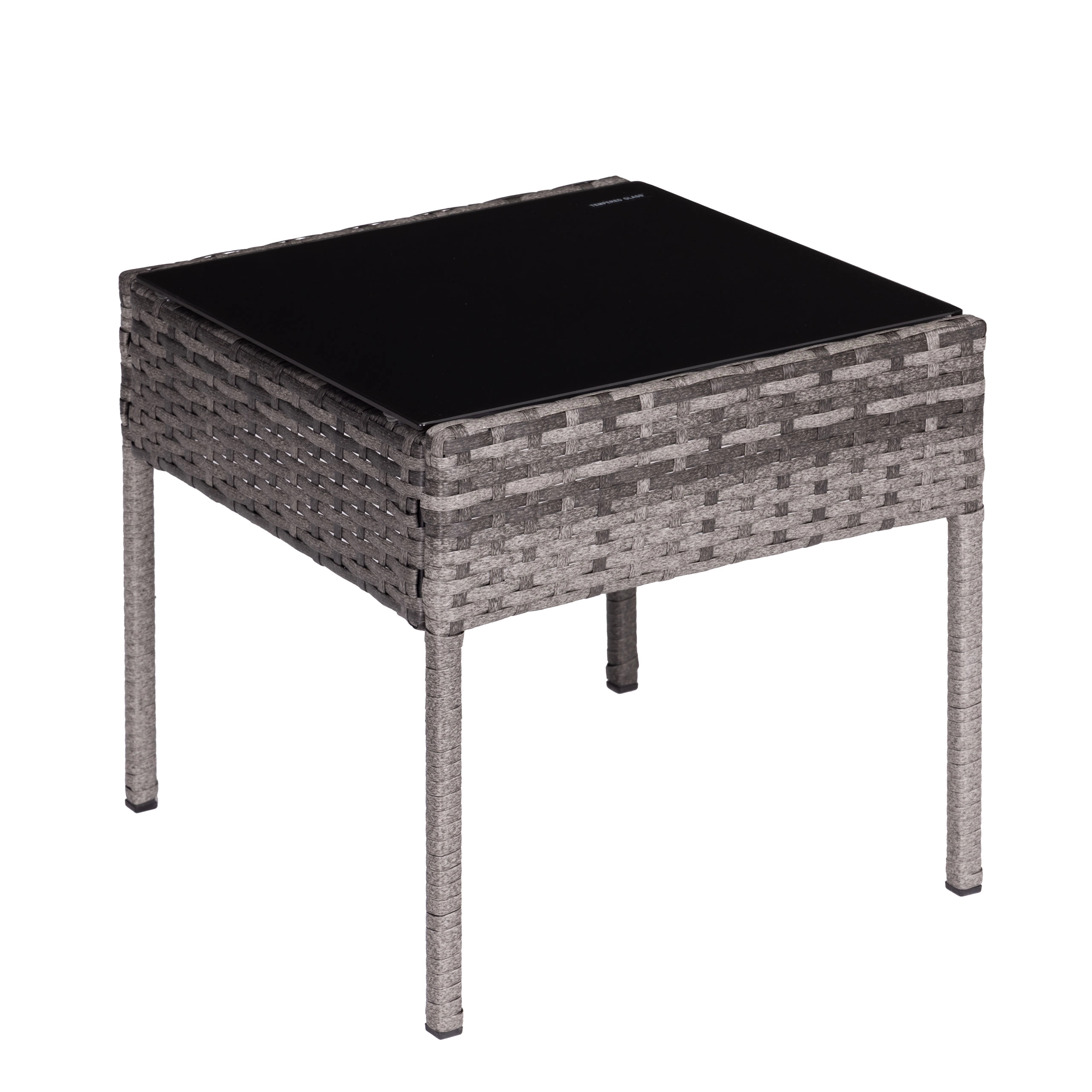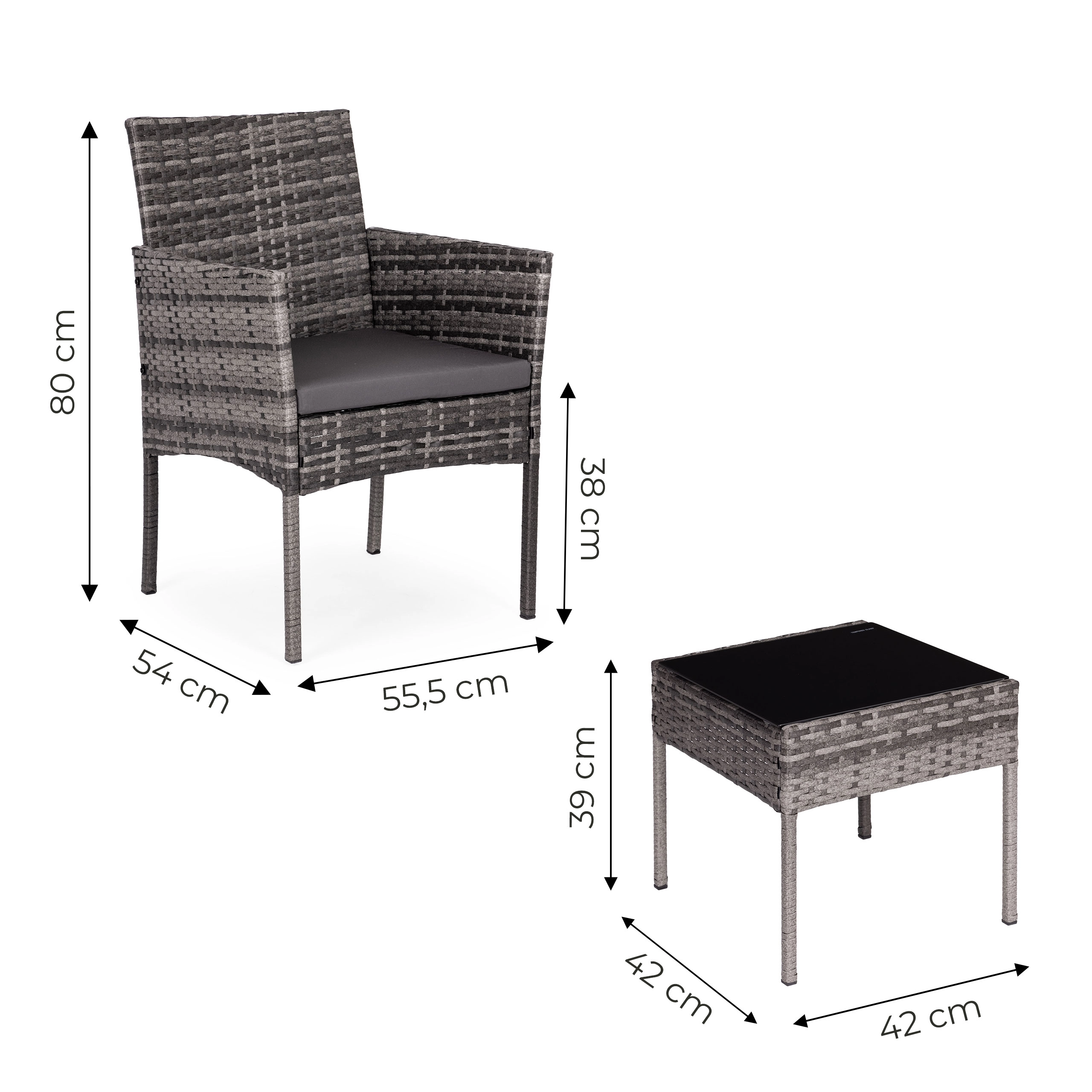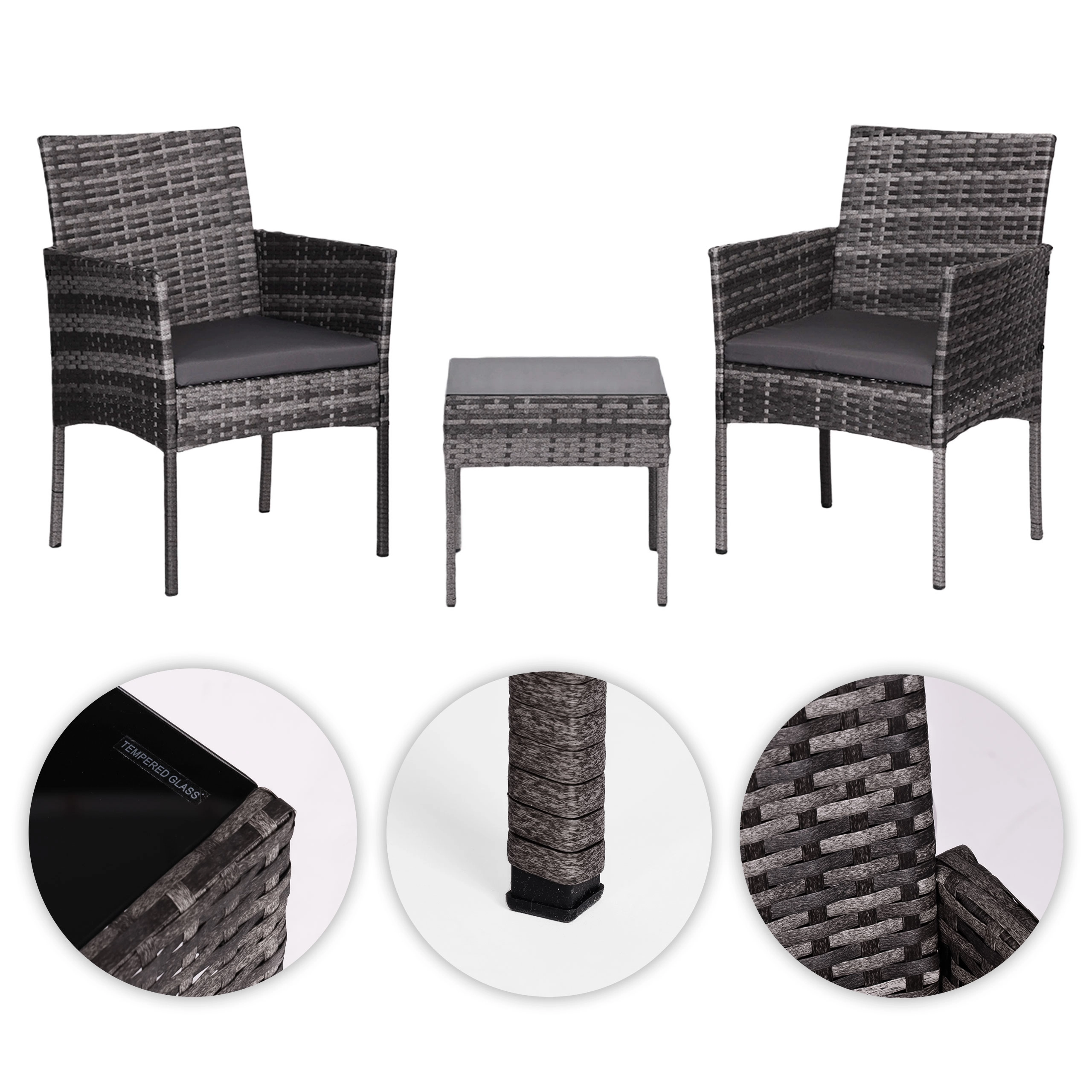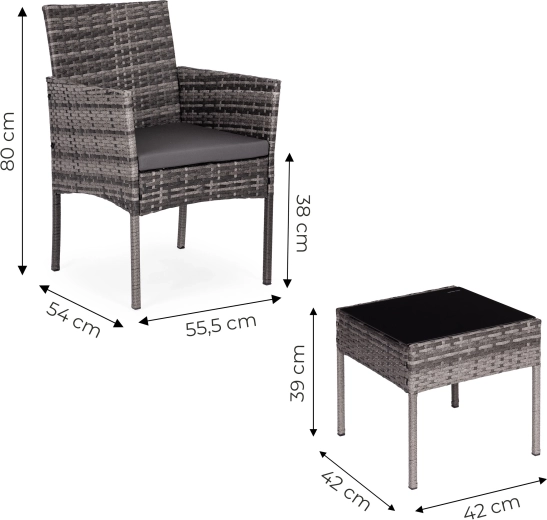 Il tavolino quadrato con piano temperato di sicurezza (5 mm) è ideale per bevande e piccoli oggetti; le poltrone sono completate da morbidi cuscini resistenti a UV e umidità. Le estremità antiscivolo delle gambe aumentano la stabilità su diverse superfici e proteggono il pavimento.