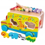Il giocattolo in legno Bino è il perfetto compagno per ogni bambino. Questo camion serve non solo come giocattolo da traino, ma offre anche un'elemento musicale divertente grazie al xilofono sul tetto con bacchette. Il giocattolo aiuta a sviluppare abilità come il riconoscimento dei colori e delle forme e supporta la coordinazione dei movimenti.