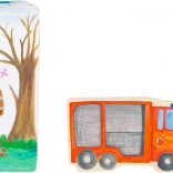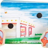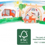 Con il libretto di legno Pompieri, i bambini si immergono nel mondo d'azione dei pompieri. Il libro è fornito di figure di legno che ispirano l'invenzione di storie proprie. Dopo aver spento il fuoco, i bambini possono rimettere le figure nel libro, imparando così i fondamenti dell'ordine e della responsabilità.
