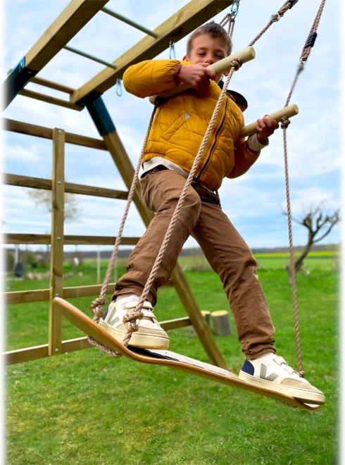 Questa altalena insolita unisce divertimento e sviluppo motorio. La tavola in robusto compensato con bordi rialzati e le maniglie regolabili in legno massello consentono ai bambini di allenare in sicurezza equilibrio, coordinazione e stabilità. Grazie alla superficie antiscivolo, dondolarsi in piedi è più sicuro e confortevole.
