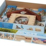Crea un presepe natalizio iconico con questo set di costruzione in legno meticolosamente realizzato. Include listelli di legno, pezzi per il tetto e frontoni, e sagome di cartone dettagliate per finestre e porte.