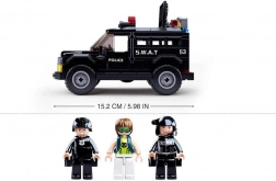Auto della polizia nera con tetto apribile per minifigure, scritte S.W.A.T. e dettagli realistici come luci, specchietti e ruote robuste.