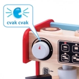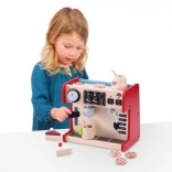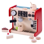 I bambini possono provare con questa macchina da caffè cosa significa essere un barista. Il kit include una macchina da caffè con leva rimovibile e dosatore di latte mobile. Tutto è completato da un display di controllo con un pulsante rotante che emette un clic e bottoni dipinti.