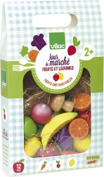 Questo set di qualità di VILAC offre ai bambini una selezione variopinta di frutta e verdura preferite. La realizzazione in legno con accessori in feltro è resistente, sicura e piacevole al tatto. Il set è perfetto per i giochi nella cucina dei bambini e al mercato, favorisce la comunicazione, la creatività e l’apprendimento di una sana alimentazione.