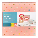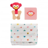 Elegante set regalo per neonati con motivo della scimmietta di PETIT COLLAGE, pensato con accessori pratici e rispetto per la natura. Include un massaggiagengive in legno di faggio FSC, un morbido fazzoletto in cotone biologico e un libricino illustrato in cartone. La confezione è completamente priva di plastica e i materiali provengono da fonti sostenibili.