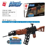 Il set di costruzione Qman Model Power 6006 è ispirato al famoso fucile d'assalto Kalashnikov. Una volta montato, consente ai bambini di sparare in sicurezza freccette in schiuma smussate. Disponibile sotto forma di mattoni di plastica colorati, compatibili con Lego, Sluban, Cobi e altri marchi.