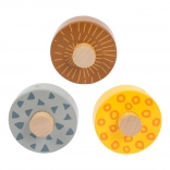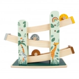 Questa bellissima pista in legno offre ai bambini la possibilità di osservare tre ruote, ciascuna con un design unico, che scorrono giù per tre rampe. È decorata con illustrazioni di animali che vivono nel safari e piante della giungla.