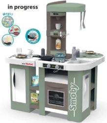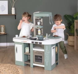 Questa ampia cucina ispirata al marchio TEFAL offre tutto per un gioco autentico: piano di lavoro, lavello con rubinetto, macchina da caffè a capsule, distributore di bevande frizzanti, forno, lavastoviglie, frigorifero e mensole aperte. La funzione elettronica della pentola magica, dopo aver aggiunto l’acqua e premuto il pulsante, crea vere bollicine che affascineranno ogni piccolo chef.
