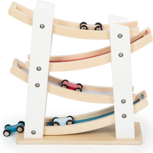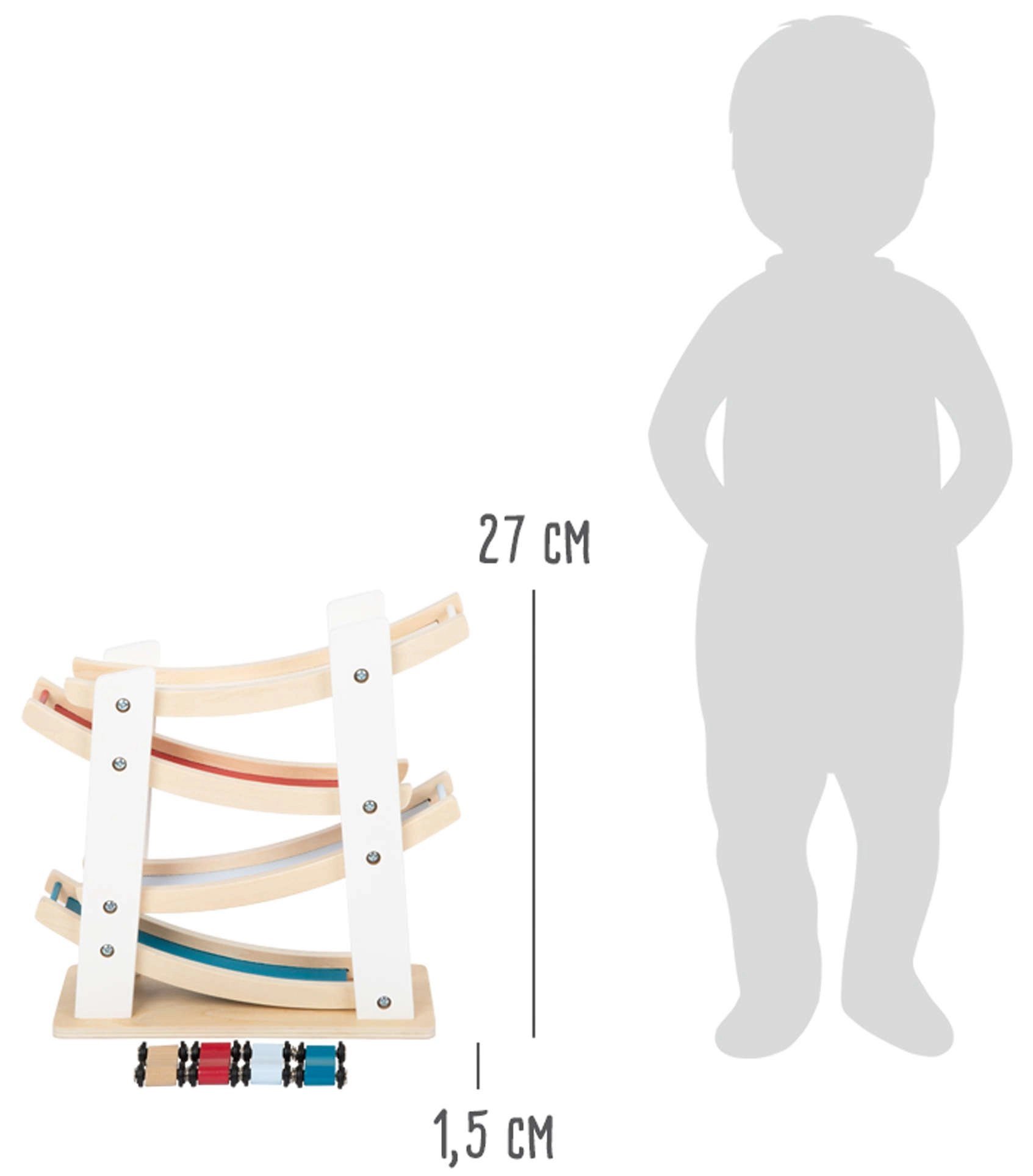Questa pista in legno di qualità offre un principio semplice che i bambini adorano: posiziona la macchinina sul livello superiore e guarda come scivola velocemente lungo le curve fino in fondo. La base stabile e le superfici lisce garantiscono un utilizzo sicuro e duraturo.