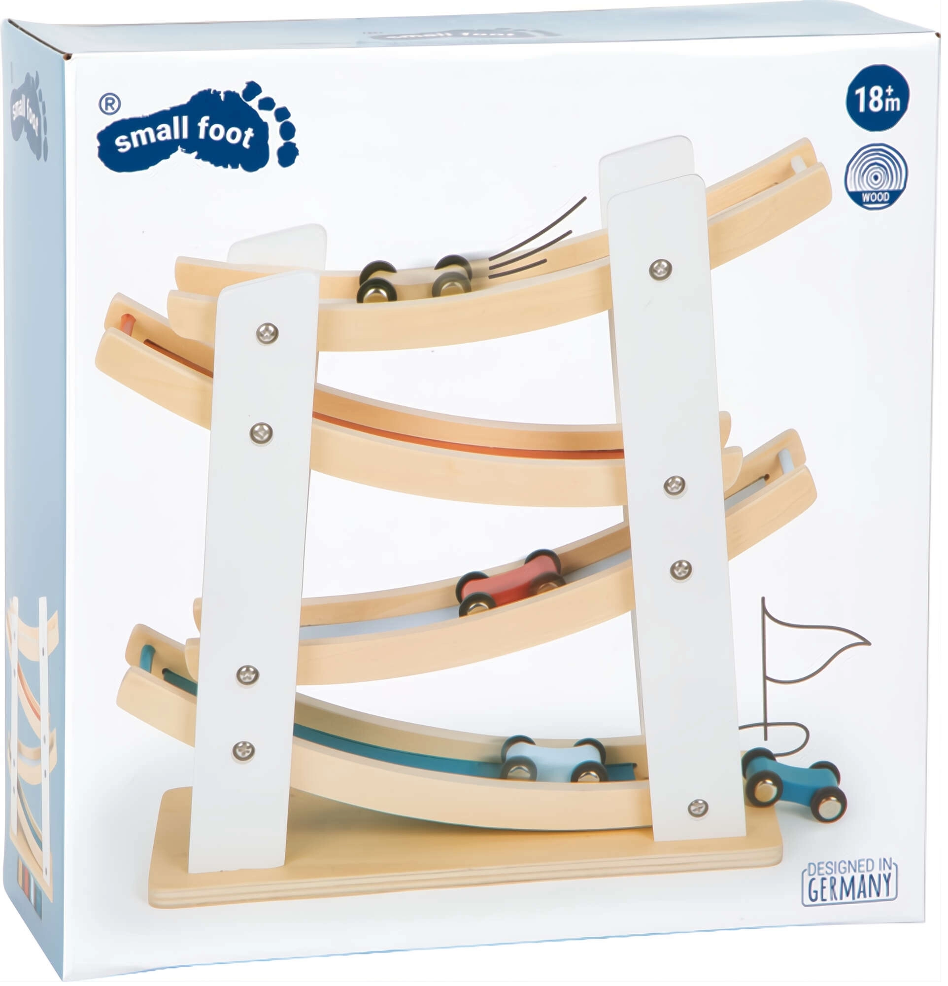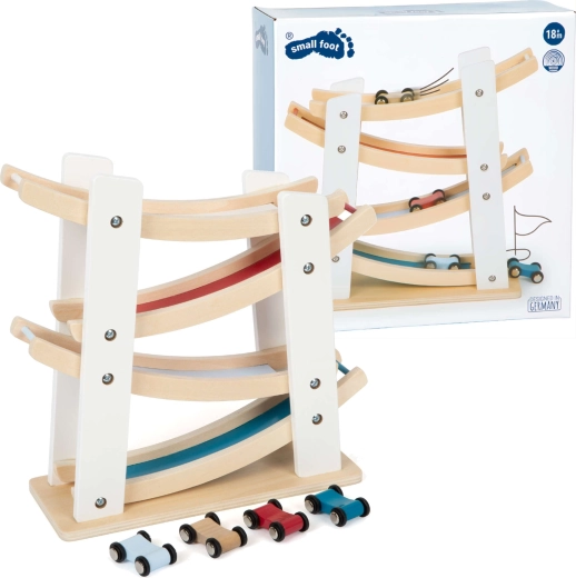 Scopri il divertimento per i più piccoli con la pista da corsa in legno con macchinine di Small Foot. La struttura robusta in legno naturale, quattro macchinine colorate e la discesa fluida sulle rampe a cascata sviluppano la motricità fine, la coordinazione occhio–mano e la comprensione di causa ed effetto. Giocattolo ideale dai 18 mesi per il gioco creativo quotidiano.