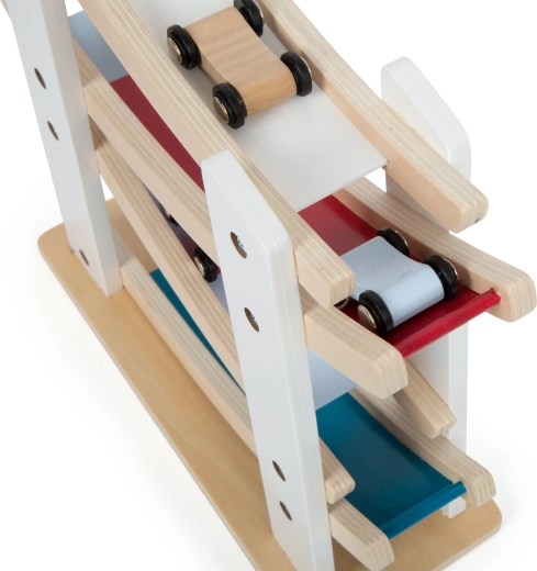 La pista è realizzata in legno naturale di alta qualità con base stabile e bordi levigati per un gioco sicuro dei più piccoli.