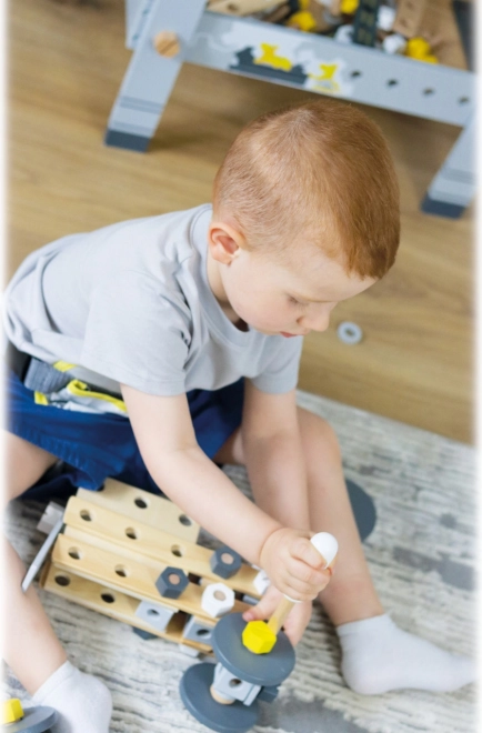 La confezione include ricchi accessori: listelli e tavole con fori preforati, cubi, ruote, adattatori per ruote, distanziali e due utensili in legno – chiave e cacciavite. Tutto si ripone in modo ordinato nel pratico box, così nessun pezzo andrà perso.