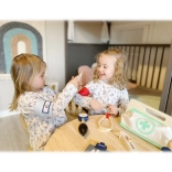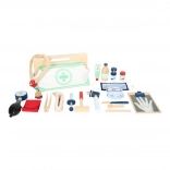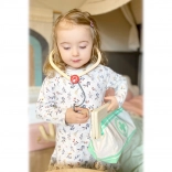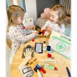 Il set include numerosi accessori: stetoscopio, termometro con temperatura regolabile, siringa con meccanismo mobile, otoscopio con vera lente, ma anche sfigmomanometro con bracciale e pompetta, disinfettante con pompetta, boccette, cucchiaino, pinzetta, bisturi, martelletto riflessi e mascherine in tessuto. I bambini possono prendersi cura del “paziente”, imparare le basi dell’assistenza e superare la paura della visita medica.