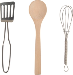 Include pentola con coperchio, padella, frusta, spatola e cucchiaio di legno, che aiutano durante il gioco del cuoco.