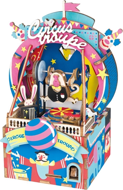 Assemblate un modello dettagliato e colorato di una piccola esibizione circense, che prende vita con movimento e musica. I carillon RoboTime si distinguono per i dettagli ben studiati e l’alta qualità di realizzazione. Il meccanismo a carica da 18 note con componenti giapponesi garantisce un suono pulito e sufficientemente potente.