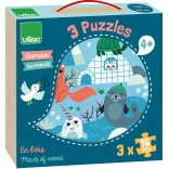 Tre puzzle con immagini di savana, foresta e ghiacciai che mostrano ai bambini il mondo degli animali nel loro ambiente naturale.