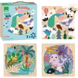 Scoprite il meraviglioso mondo della natura attraverso questo set di puzzle di legno. Ogni immagine delle tre presenta un tema diverso: avventure tra le nuvole, il mondo sottomarino e avventure nella giungla. La scena nel cielo è impreziosita da un bellissimo pavone, un'aquila e altri uccelli. I motivi marini sono animati da una grande balena, un polpo e pesci amichevoli. La scena terrestre include una tigre, un coccodrillo e un pappagallo in un allegro ambiente giungla.
