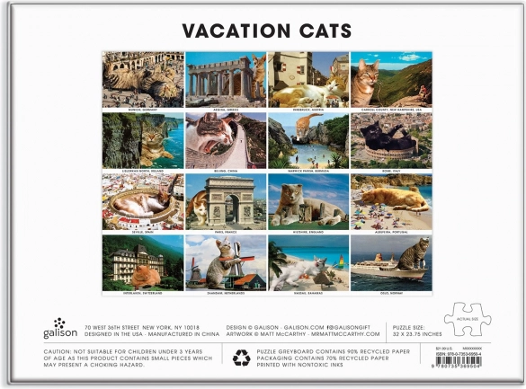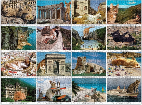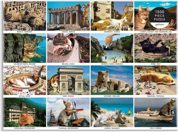 Divertente puzzle con gatti in vacanza da 1500 pezzi offre svago e relax. Include sedici fotografie realistiche, in cui puoi ammirare gatti che si godono luoghi famosi del mondo.