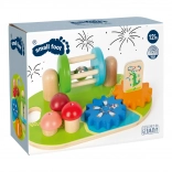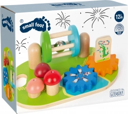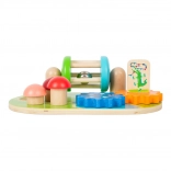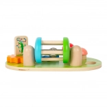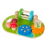 La tavola in legno offre diversi elementi mobili come ingranaggi e spugnette per lo sviluppo della motricità fine.