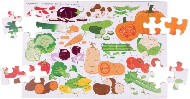 Il puzzle include diversi tipi di verdure come zucche, peperoni e carote, insegnando ai bambini la nutrizione e uno stile di vita sano.