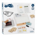 Il set include card prodotto, lettore di codici a barre, rotolo di scontrini a strappo, scanner e 15 monete in legno bifacciali. La combinazione di legno e plastica assicura resistenza e un gradevole design nordico con venature del legno a vista. La cassa favorisce l’apprendimento del calcolo, lo sviluppo della fantasia e l’interazione sociale nel gioco del negozio.