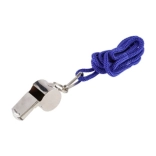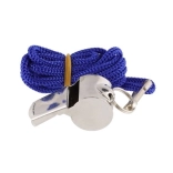 Questo fischietto di metallo di colore argento lucido è progettato per una chiara proiezione del suono, rendendolo adatto per un uso sportivo o di emergenza. Viene fornito con un cordino blu in tessuto, che permette una comoda portabilità al collo. Ideale per allenatori, arbitri, così come per eventi familiari.