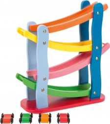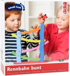 Pista da corsa in legno per bambini è un giocattolo colorato che offre divertimento per ore. Con le macchinine colorate, i bambini sviluppano la loro motricità e percepiscono i colori mentre scendono velocemente lungo le piste in legno.